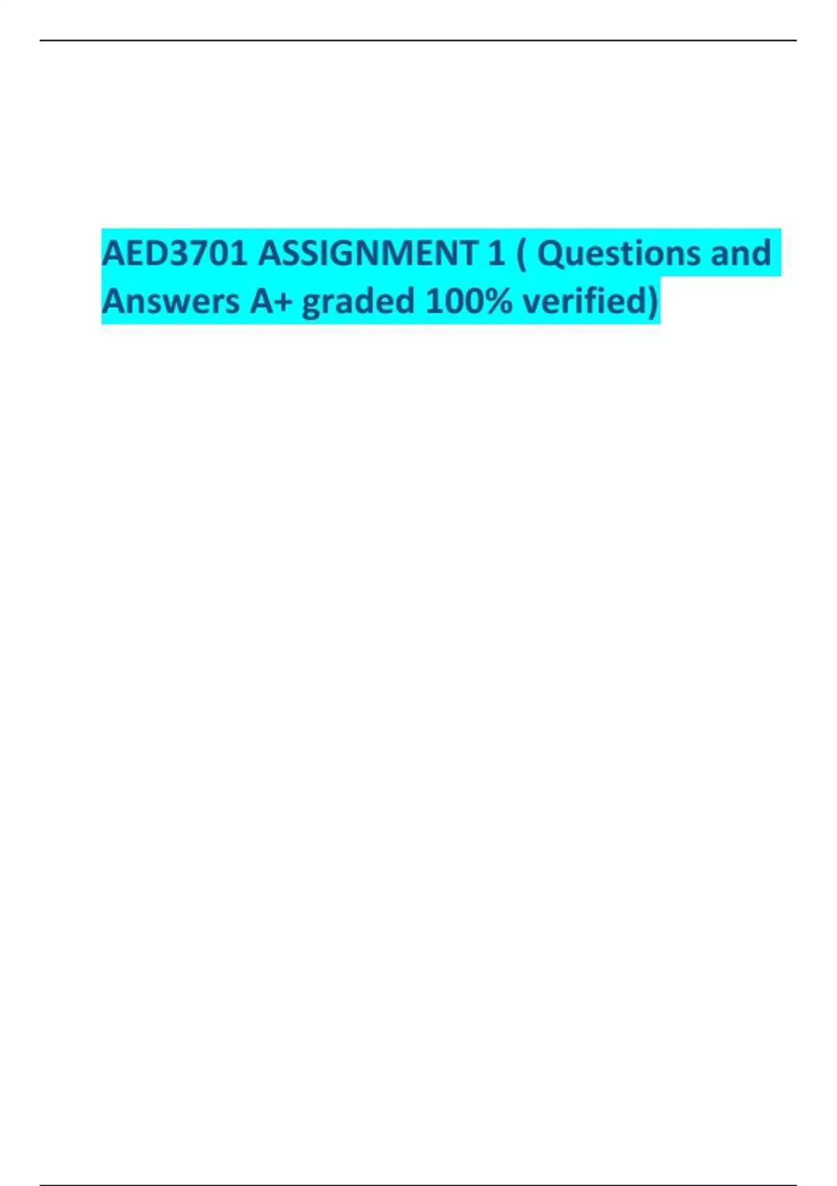 AED3701 ASSIGNMENT 1 ( Questions and Answers A+ graded 100% verified)1. Assessment of learning – in this type of assessment, evidence is collected for summative judgement of learner’s performance. Teachers use this assessment to identify learner’s skills and knowledge gaps. Assessment of learning occurs when teachers use evidence of student learning to make judgements on learner’s achievement against goals and standards. For example, classroom discussion and observation. 2. Assessment for learning – this assessment is done throughout the teaching and learning process to constantly adjust instructional strategy. It helps teachers to identify learner’s progress in a specific topic. Assessment for learning holds the key to good teaching .it offers to traditional assessment in school. For example, test, exam. 3. Continuous assessment – this assessment offers regular response about the teaching and learning procedure. It can strengthen the efficiency of learning and teaching and encourages the understanding of teaching as a foundational procedure that progress over time with response and input from learners. An example, a regular remark of practical attitudes or skills such as collaboration during tutorials. 4. Authentic assessment – in an assessment made on learners whose activities or skills are assessed through real world tasks, which would require them apply their skills and knowledge. It helps in assessing the individual in a better way as he or she applies their skills and knowledge. For example, in arts a learner can be taught how to draw, but some drawings will need a learner to apply skills to a certain given task. 5. Systematic assessment – systematic assessment of student learning refers to gathering information about the knowledge gained by students and analyzing that in order to find out the effectiveness and efficiency of learning to students. This assessment is very important to teachers because they get to know about the effectiveness of their teaching skills by linking the student’s performances to certain learning objects. For example, without systematic assessment, a teacher would not be able to find out which teaching method is most effective and which method he should be abandoned. QUESTION 4 4.1. Diversity in learning is what makes every learner to vary from each other by being unique in their own way of understanding including speed and memory. It also involves learners with different abilities and capabilities in different units or subjects. In this case there is a learner who is above others by being academically gifted, another who is average and the one who is not coping. Not all people can always be equal with same levels of capability. 4.2. As a teacher should firstly try to give a Tsharivhone attention and spend time with him, in order to know what could be barriers that affected him for not coping in school work and to help him to overcome them. Make frequent meetings with his parents/ guardians; this will help to cater learning needs to this learner. 4.3. Diagnostic assessment – because this assessment it will help me to know Tsharivhone’s strengths, weakness and the skills and knowledge before giving the class an activity. It is necessary to know what kind of learners I am going to teach. 4.4. I will encourage Thendo to take on leadership roles in class, try more challenges problems and also participate in classroom debates. The more she engages and excels in activities that make her nervous, the more comfortable and confident she