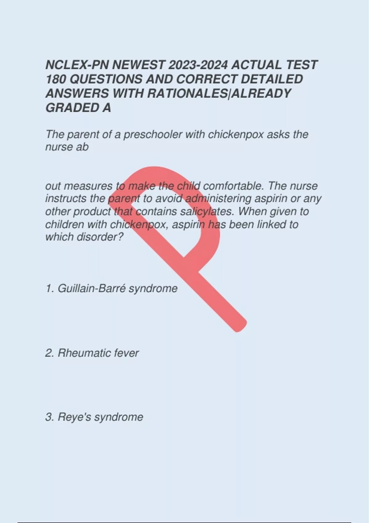 NCLEX-PN NEWEST ACTUAL TEST 180 QUESTIONS AND CORRECT DETAILED ANSWERS WITH RATIONALES|ALREADY GRADED A