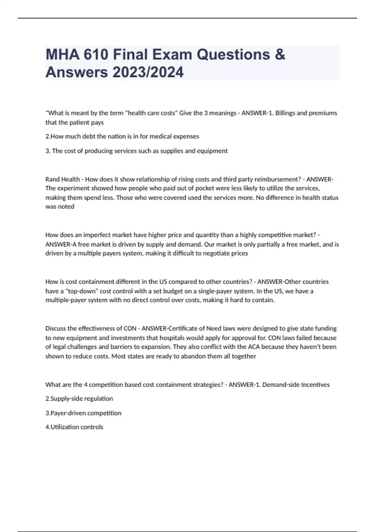 MHA 610 Final Exam Questions & Answers 2023/2024 "What is meant by the term "health care costs" Give the 3 meanings - ANSWER-1. Billings and premiums that the patient pays 2.How much debt the nation is in for medical expenses 3. The cost of producing services such as supplies and equipment Rand Health - How does it show relationship of rising costs and third party reimbursement? - ANSWER-The experiment showed how people who paid out of pocket were less likely to utilize the services, making them spend less. Those who were covered used the services more. No difference in health status was noted How does an imperfect market have higher price and quantity than a highly competitive market? - ANSWER-A free market is driven by supply and demand. Our market is only partially a free market, and is driven by a multiple payers system, making it difficult to negotiate prices How is cost containment different in the US compared to other countries? - ANSWER-Other countries have a "top-down" cost control with a set budget on a single-payer system. In the US, we have a multiple-payer system with no direct control over costs, making it hard to contain. Discuss the effectiveness of CON - ANSWER-Certificate of Need laws were designed to give state funding to new equipment and investments that hospitals would apply for approval for. CON laws failed because of legal challenges and barriers to expansion. They also conflict with the ACA because they haven't been shown to reduce costs. Most states are ready to abandon them all together What are the 4 competition based cost containment strategies? - ANSWER-1. Demand-side Incentives 2.Supply-side regulation 3.Payer-driven competition 4.Utilization controls