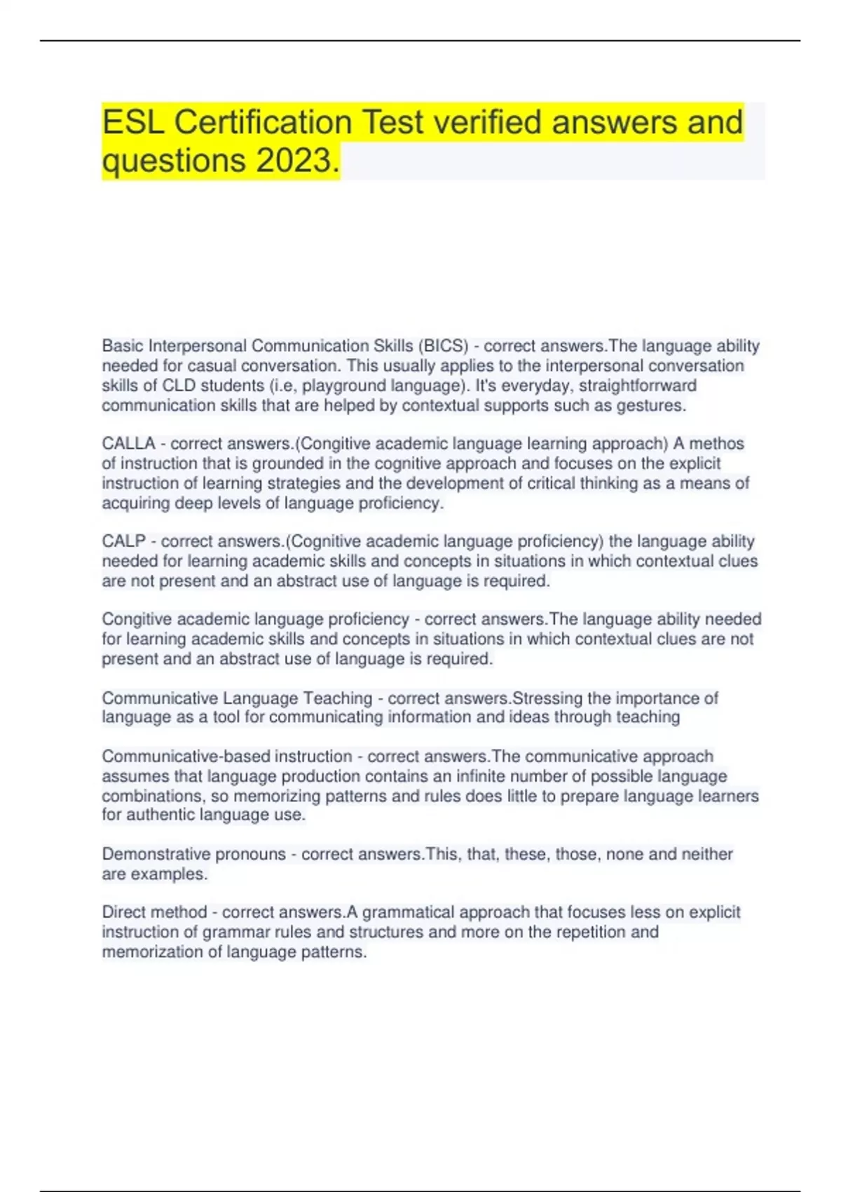 ESL Certification Test verified answers and questions 2023. Basic Interpersonal Communication Skills (BICS) - correct answers.The language ability needed for casual conversation. This usually applies to the interpersonal conversation skills of CLD students (i.e, playground language). It's everyday, straightforrward communication skills that are helped by contextual supports such as gestures. CALLA - correct answers.(Congitive academic language learning approach) A methos of instruction that is grounded in the cognitive approach and focuses on the explicit instruction of learning strategies and the development of critical thinking as a means of acquiring deep levels of language proficiency. CALP - correct answers.(Cognitive academic language proficiency) the language ability needed for learning academic skills and concepts in situations in which contextual clues are not present and an abstract use of language is required. Congitive academic language proficiency - correct answers.The language ability needed for learning academic skills and concepts in situations in which contextual clues are not present and an abstract use of language is required. Communicative Language Teaching - correct answers.Stressing the importance of language as a tool for communicating information and ideas through teaching Communicative-based instruction - correct answers.The communicative approach assumes that language production contains an infinite number of possible language combinations, so memorizing patterns and rules does little to prepare language learners for authentic language use. Demonstrative pronouns - correct answers.This, that, these, those, none and neither are examples. Direct method - correct answers.A grammatical approach that focuses less on explicit instruction of grammar rules and structures and more on the repetition and memorization of language patterns.