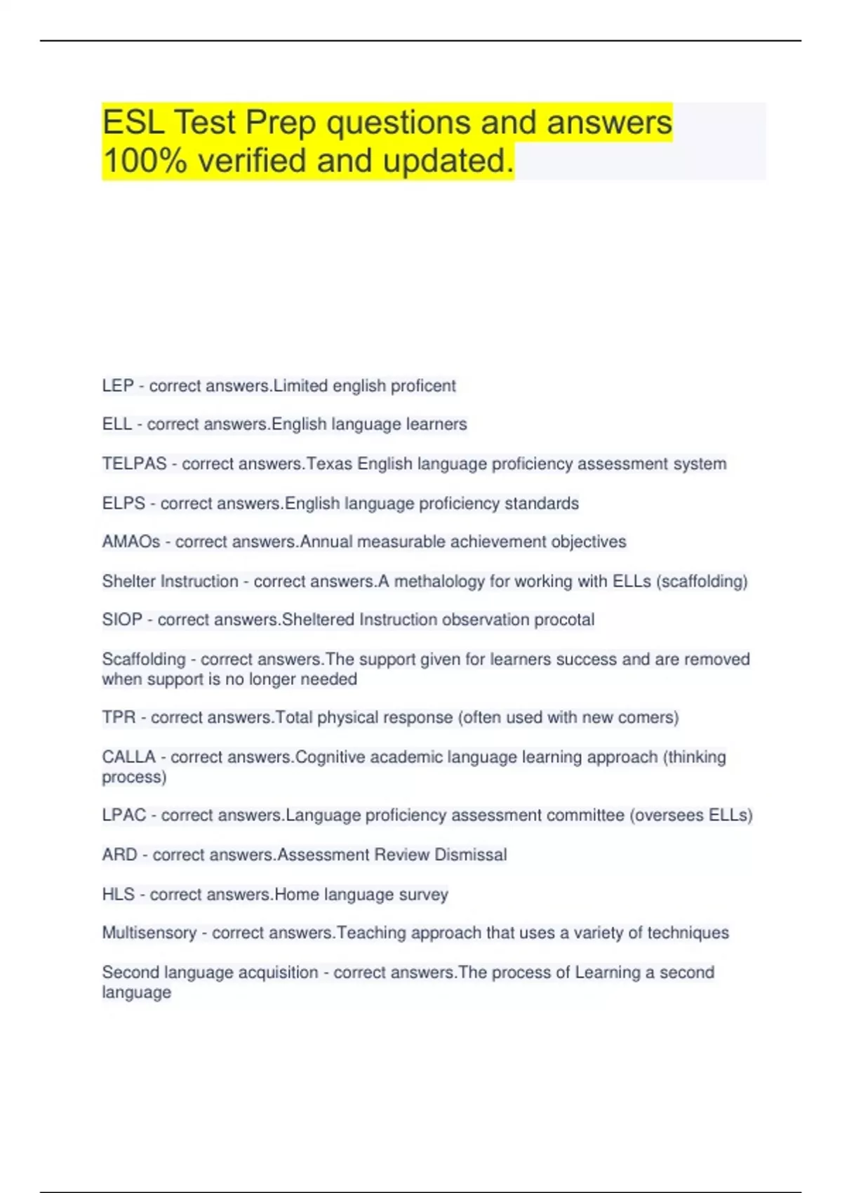 ESL Test Prep questions and answers 100% verified and updated. LEP - correct answers.Limited english proficent ELL - correct answers.English language learners TELPAS - correct answers.Texas English language proficiency assessment system ELPS - correct answers.English language proficiency standards AMAOs - correct answers.Annual measurable achievement objectives Shelter Instruction - correct answers.A methalology for working with ELLs (scaffolding) SIOP - correct answers.Sheltered Instruction observation procotal Scaffolding - correct answers.The support given for learners success and are removed when support is no longer needed TPR - correct answers.Total physical response (often used with new comers) CALLA - correct answers.Cognitive academic language learning approach (thinking process) LPAC - correct answers.Language proficiency assessment committee (oversees ELLs) ARD - correct answers.Assessment Review Dismissal HLS - correct answers.Home language survey Multisensory - correct answers.Teaching approach that uses a variety of techniques Second language acquisition - correct answers.The process of Learning a second language Cognates - correct answers.Words that had a common root between the second language and the first language Realia - correct answers.The use of real objects in teaching False cognates - correct answers.Negative transfers of cognates Overgeneralizations - correct answers.Assuming certain words go with everything Negative transfer - correct answers.Issues from one language to another PLDs - correct answers.Proficiency Level Discriptures (found in Telpas and ELPs) Vocabulary - correct answers.Words specific to a certain content Language proficiency - correct answers.Ability to function in that language Affective - correct answers.A risk-free, inviting environment that lowers a students defense so that they can learn Cognitive - correct answers.Thinking about the learning process Morpheme - correct answers.Smallest meaning of words Morphology - correct answers.Word study of individually meaningful chucks in a word Fluency - correct answers.Appropriate rate of speed a student reads with accuracy and expression Bilingual Program - correct answers.A program to serve students by teaching in native and English language. Goal is to become proficient in academic English and academic content success. ESL program - correct answers.Addresses the need of English learners CALP - correct answers.Cognitive academic language proficiency BICS - correct answers.Basic interpersonal communication skills Academic Language proficiency - correct answers.Proficient in the Content Early production stage - correct answers.Beginning of speech Speech Emergence Stage - correct answers.When we're starting to hear sentences. They're answering and asking questions