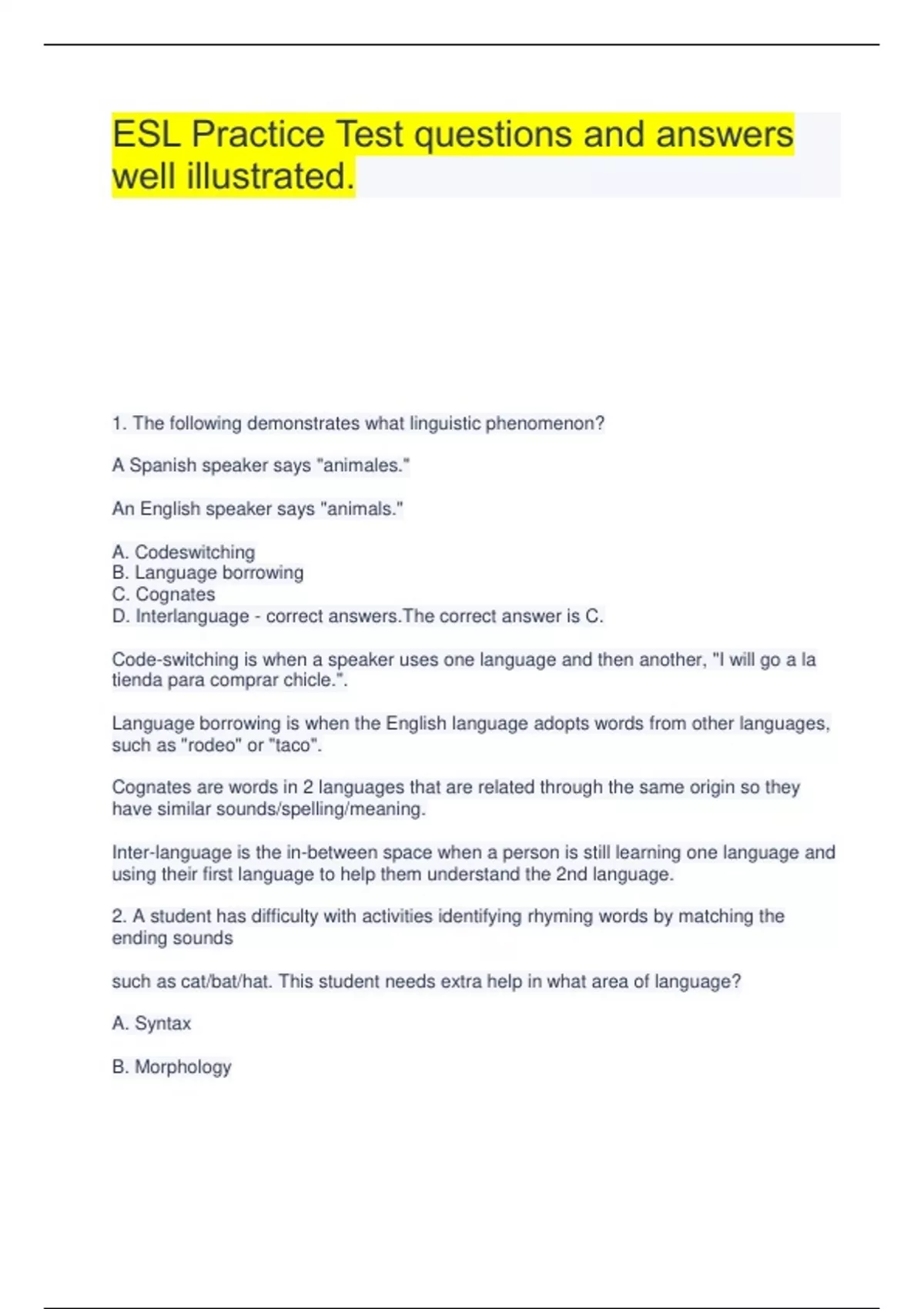 ESL Practice Test questions and answers well illustrated. 1. The following demonstrates what linguistic phenomenon? A Spanish speaker says "animales." An English speaker says "animals." A. Codeswitching B. Language borrowing C. Cognates D. Interlanguage - correct answers.The correct answer is C. Code-switching is when a speaker uses one language and then another, "I will go a la tienda para comprar chicle.". Language borrowing is when the English language adopts words from other languages, such as "rodeo" or "taco". Cognates are words in 2 languages that are related through the same origin so they have similar sounds/spelling/meaning. Inter-language is the in-between space when a person is still learning one language and using their first language to help them understand the 2nd language. 2. A student has difficulty with activities identifying rhyming words by matching the ending sounds such as cat/bat/hat. This student needs extra help in what area of language? A. Syntax B. Morphology C. Phonology D. Semantics - correct answers.Explanation: The correct answer is C. Syntax is structure or grammar, not sounds. Morphology is the level of words, not sounds. Phonology is sounds. Semantics is the meaning or definitions of words, not sounds. 3. When determining the appropriate register to use, what does a speaker take into account? A. Understanding the formality of the situation B. Understanding the topic of the situation C. Understanding the appropriate grammar rules used in the situation D. Understanding the cultural heritage of the speakers - correct answers.The correct answer is A. Understanding the formality of the situation is knowing your audience and the context or formality of the situation you are in is the most salient factor for understanding register. If you understand the topic of the situation you can discuss the same topic across multiple registers. In English, grammar usually does not impact register. The cultural heritage does not impact the register you use in English. 4. A student begins a sentence in English, inserts a Spanish phrase, and then finishes the sentence in English. The student is demonstrating which of the following language phenomena? A. Bi-dialectism B. Code-switching C. Language dominance D. Additive bilingualism - correct answers.The correct answer is B. Bi-dialectism is when someone speaks two dialects. Code-switching is when people go in and out of two languages or codes. Language dominance refers to which language is a person's dominant language.