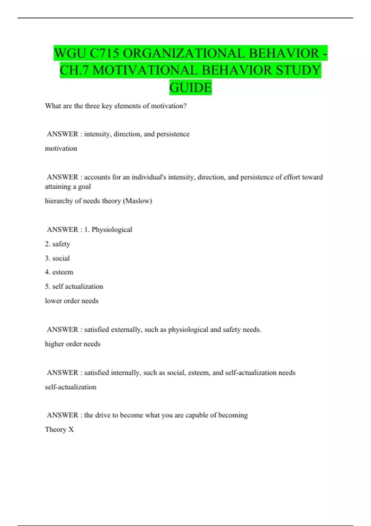 WGU C715 ORGANIZATIONAL BEHAVIOR - CH.7 MOTIVATIONAL BEHAVIOR STUDY GUIDE