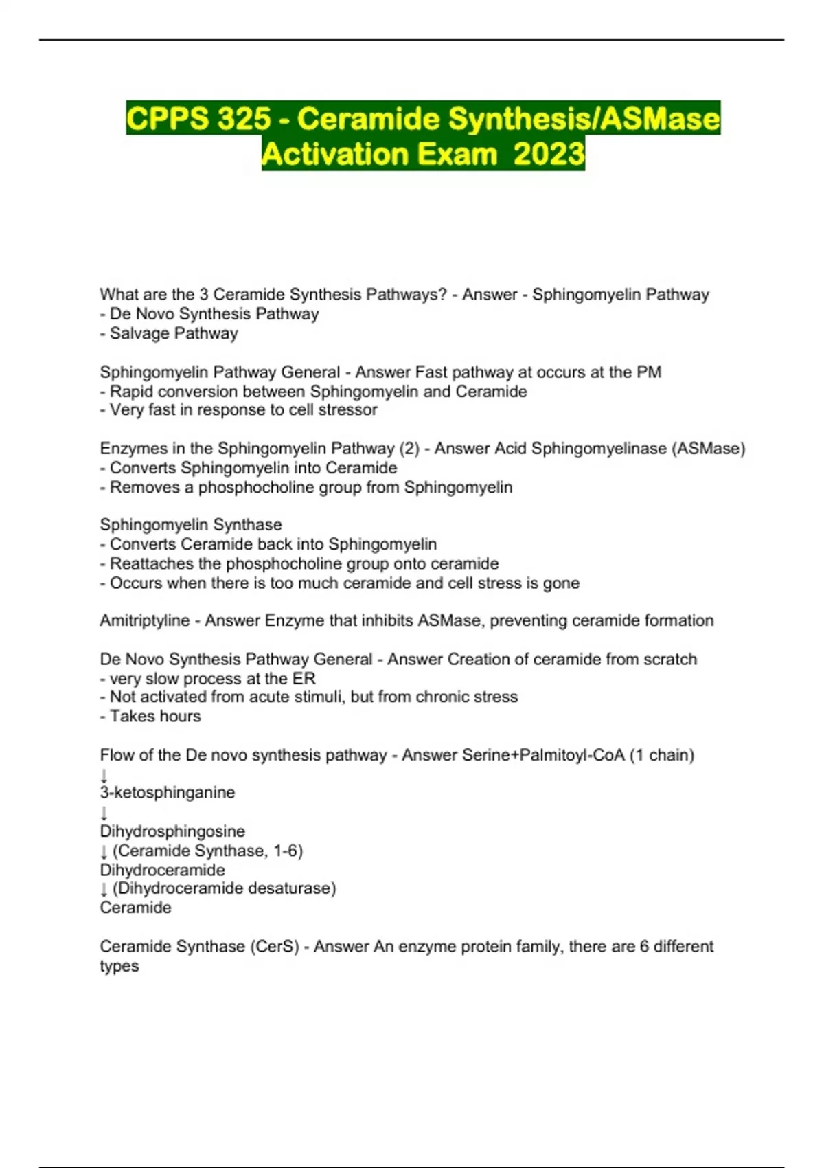 CPPS 325 - Ceramide Synthesis/ASMase Activation Exam 2023...