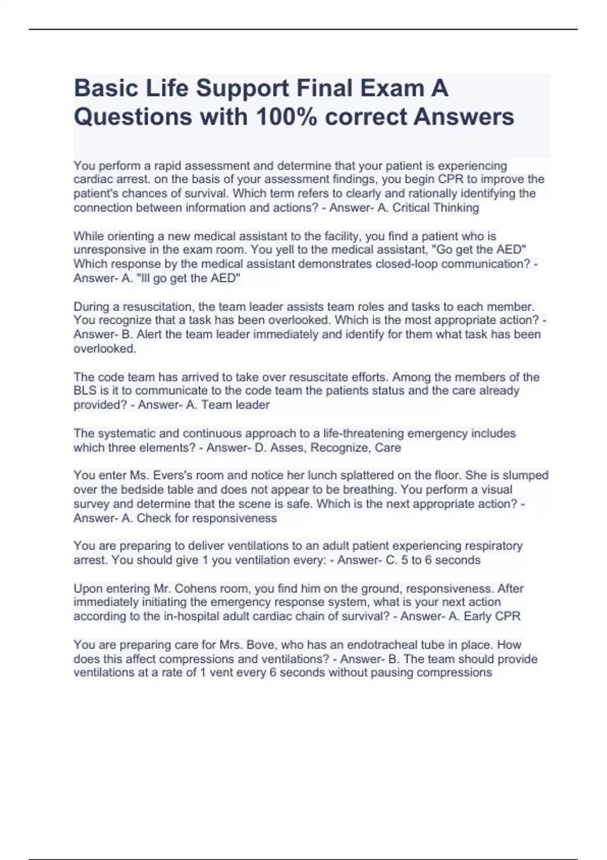 Basic Life Support Final Exam A Questions with 100% correct Answers