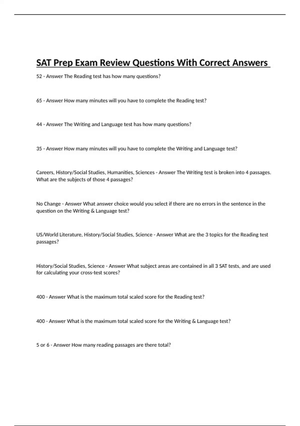 52 - Answer The Reading test has how many questions? 65 - Answer How many minutes will you have to complete the Reading test? 44 - Answer The Writing and Language test has how many questions? 35 - Answer How many minutes will you have to complete the Writing and Language test? Careers, History/Social Studies, Humanities, Sciences - Answer The Writing test is broken into 4 passages. What are the subjects of those 4 passages? No Change - Answer What answer choice would you select if there are no errors in the sentence in the question on the Writing & Language test? US/World Literature, History/Social Studies, Science - Answer What are the 3 topics for the Reading test passages? History/Social Studies, Science - Answer What subject areas are contained in all 3 SAT tests, and are used for calculating your cross-test scores? 400 - Answer What is the maximum total scaled score for the Reading test? 400 - Answer What is the maximum total scaled score for the Writing & Language test? 5 or 6 - Answer How many reading passages are there total? 2 - Answer What is the maximum number of passages for each set of questions? 10 or 11 - Answer How many questions are there for each passage on the Reading test? 11 - Answer How many questions are there for each passage on the Writing & Language test?