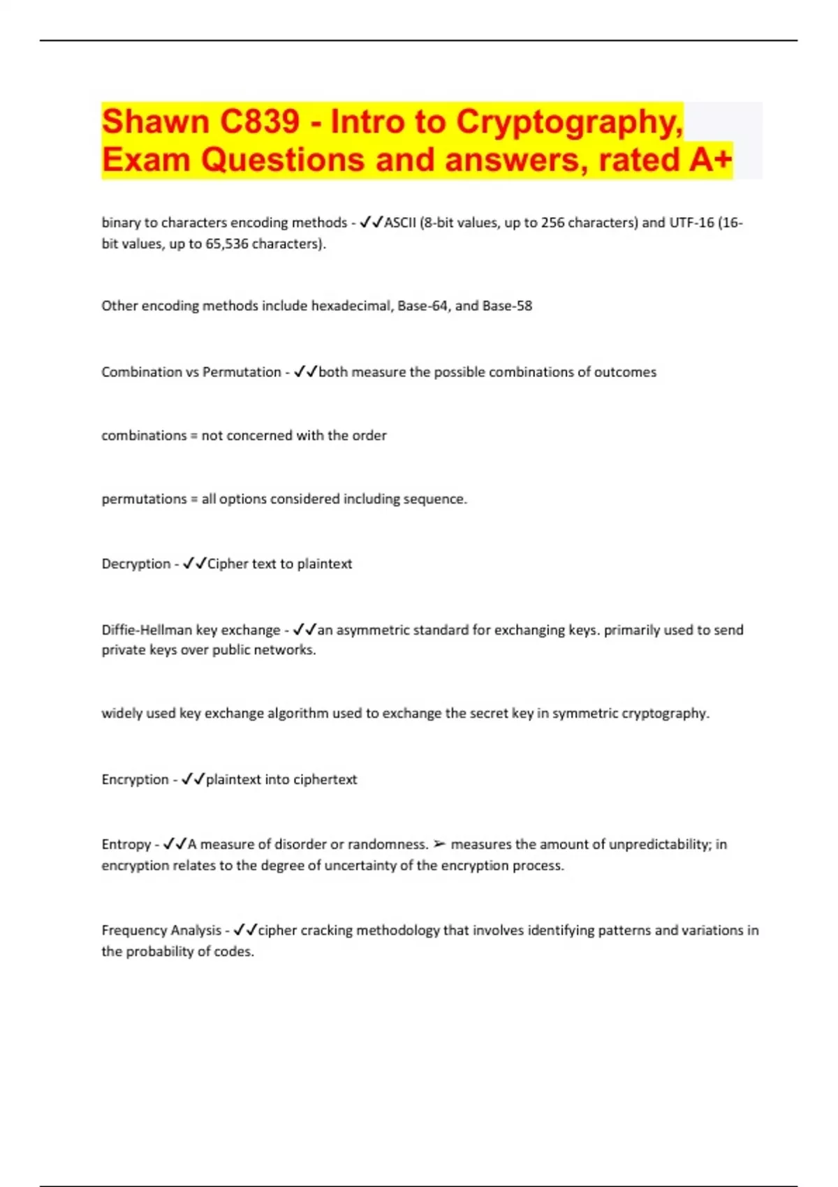 Shawn C839 - Intro to Cryptography, Exam Questions and answers, rated A+ binary to characters encoding methods - ASCII (8-bit values, up to 256 characters) and UTF-16 (16- bit values, up to 65,536 characters). Other encoding methods include hexadecimal, Base-64, and Base-58 Combination vs Permutation - both measure the possible combinations of outcomes combinations = not concerned with the order permutations = all options considered including sequence. Decryption - Cipher text to plaintext Diffie-Hellman key exchange - an asymmetric standard for exchanging keys. primarily used to send private keys over public networks. widely used key exchange algorithm used to exchange the secret key in symmetric cryptography. Encryption - plaintext into ciphertext Entropy - A measure of disorder or randomness. measures the amount of unpredictability; in encryption relates to the degree of uncertainty of the encryption process.