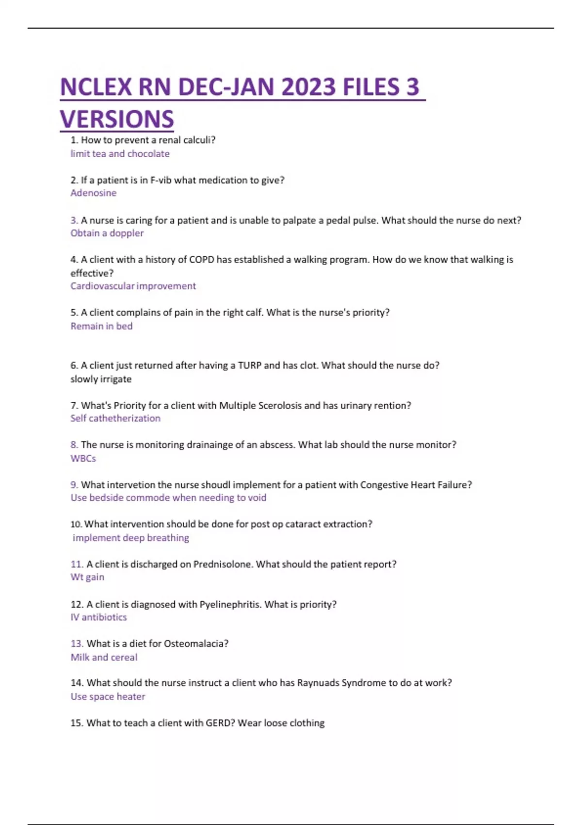 1. How to prevent a renal calculi? limit tea and chocolate 2. If a patient is in F-vib what medication to give? Adenosine 3. A nurse is caring for a patient and is unable to palpate a pedal pulse. What should the nurse do next? Obtain a doppler 4. A client with a history of COPD has established a walking program. How do we know that walking is effective? Cardiovascularimprovement 5. A client complains of pain in the right calf. What is the nurse's priority? Remain in bed 6. A client just returned after having a TURP and has clot. What should the nurse do? slowly irrigate 7. What's Priority for a client with Multiple Scerolosis and has urinary rention? Self cathetherization 8. The nurse is monitoring drainainge of an abscess. What lab should the nurse monitor? WBCs