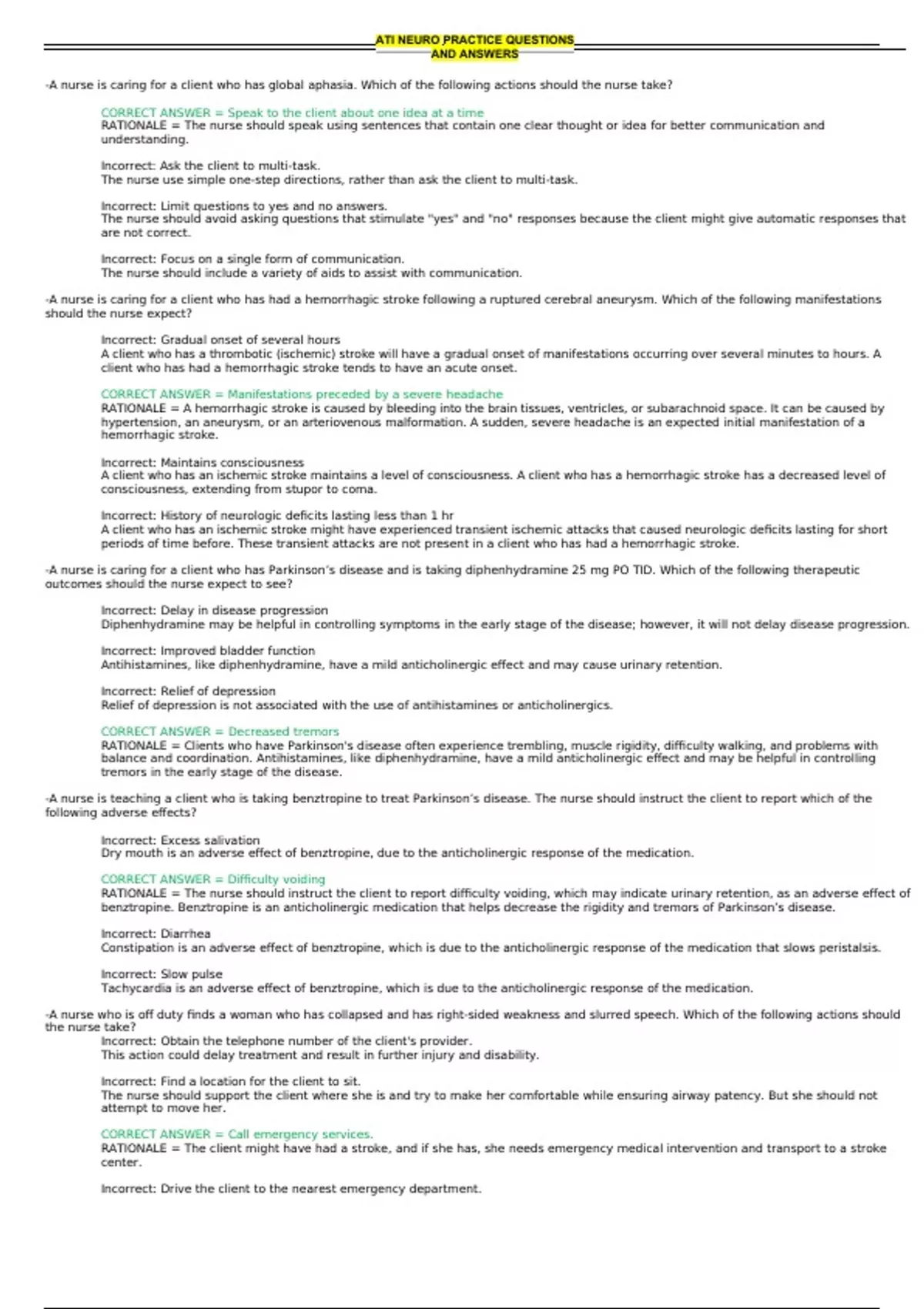 ATI NEURO PRACTICE QUESTIONS AND ANSWERS -A nurse is caring for a client who has global aphasia. Which of the following actions should the nurse take? CORRECT ANSWER = Speak to the client about one idea at a time RATIONALE = The nurse should speak using sentences that contain one clear thought or idea for better communication and understanding. Incorrect: Ask the client to multi-task. The nurse use simple one-step directions, rather than ask the client to multi-task. Incorrect: Limit questions to yes and no answers. The nurse should avoid asking questions that stimulate "yes" and "no" responses because the client might give automatic responses that are not correct. Incorrect: Focus on a single form of communication. The nurse should include a variety of aids to assist with communication. -A nurse is caring for a client who has had a hemorrhagic stroke following a ruptured cerebral aneurysm. Which of the following manifestations should the nurse expect? Incorrect: Gradual onset of several hours A client who has a thrombotic (ischemic) stroke will have a gradual onset of manifestations occurring over several minutes to hours. A client who has had a hemorrhagic stroke tends to have an acute onset. CORRECT ANSWER = Manifestations preceded by a severe headache RATIONALE = A hemorrhagic stroke is caused by bleeding into the brain tissues, ventricles, or subarachnoid space. It can be caused by hypertension, an aneurysm, or an arteriovenous malformation. A sudden, severe headache is an expected initial manifestation of a hemorrhagic stroke. Incorrect: Maintains consciousness A client who has an ischemic stroke maintains a level of consciousness. A client who has a hemorrhagic stroke has a decreased level of consciousness, extending from stupor to coma. Incorrect: History of neurologic deficits lasting less than 1 hr A client who has an ischemic stroke might have experienced transient ischemic attacks that caused neurologic deficits lasting for short periods of time before. These transient attacks are not present in a client who has had a hemorrhagic stroke. -A nurse is caring for a client who has Parkinson’s disease and is taking diphenhydramine 25 mg PO TID. Which of the following therapeutic outcomes should the nurse expect to see? Incorrect: Delay in disease progression Diphenhydramine may be helpful in controlling symptoms in the early stage of the disease; however, it will not delay disease progression. Incorrect: Improved bladder function Antihistamines, like diphenhydramine, have a mild anticholinergic effect and may cause urinary retention. Incorrect: Relief of depression Relief of depression is not associated with the use of antihistamines or anticholinergics. CORRECT ANSWER = Decreased tremors RATIONALE = Clients who have Parkinson's disease often experience trembling, muscle rigidity, difficulty walking, and problems with balance and coordination. Antihistamines, like diphenhydramine, have a mild anticholinergic effect and may be helpful in controlling tremors in the early stage of the disease. -A nurse is teaching a client who is taking benztropine to treat Parkinson’s disease. The nurse should instruct the client to report which of the following adverse effects? Incorrect: Excess salivation Dry mouth is an adverse effect of benztropine, due to the anticholinergic response of the medication. CORRECT ANSWER = Difficulty voiding RATIONALE = The nurse should instruct the client to report difficulty voiding, which may indicate urinary retention, as an adverse effect of benztropine. Benztropine is an anticholinergic medication that helps decrease the rigidity and tremors of Parkinson’s disease. Incorrect: Diarrhea Constipation is an adverse effect of benztropine, which is due to the anticholinergic response of the medication that slows peristalsis. Incorrect: Slow pulse Tachycardia is an adverse effect of benztropine, which is due to the anticholinergic response of the medication. -A nurse who is off duty finds a woman who has collapsed and has right-sided weakness and slurred speech. Which of the following actions should the nurse take? Incorrect: Obtain the telephone number of the client's provider. This action could delay treatment and result in further injury and disability. Incorrect: Find a location for the client to sit. The nurse should support the client where she is and try to make her comfortable while ensuring airway patency. But she should not attempt to move her. CORRECT ANSWER = Call emergency services. RATIONALE = The client might have had a stroke, and if she has, she needs emergency medical intervention and transport to a stroke center. Incorrect: Drive the client to the nearest emergency department. The nurse should support the client where she is and try to make her comfortable while ensuring airway patency. But she should not attempt to move her, as doing so could cause additional injury and disability. -A nurse is planning care for a client who has a cerebral aneurysm. Which of the following actions should the nurse plan to take? Incorrect: Elevate the head of bed to 45°. The nurse should elevate the head of the client's bed no higher than 30° to support venous return and lower intracranial pressure. In some cases, the bed should remain flat to increase cerebral perfusion. CORRECT ANSWER = Maintain the client on absolute bed rest. The nurse should place the client on absolute bed rest in a quiet environment. Activity can elevate blood pressure and increase the risk for bleeding. Incorrect: Administer a cleansing enema. The nurse should not administer an enema because straining or discomfort can elevate the client's blood pressure and increase intracranial pressure. Incorrect: Place the client in a room near the nurses' station. The nurse should maintain the client on bed rest in a quiet, non-stressful environment. -A nurse caring for a client who had a right-sided stroke and is exhibiting homonymous hemianopsia when eating. Which of the following actions shou