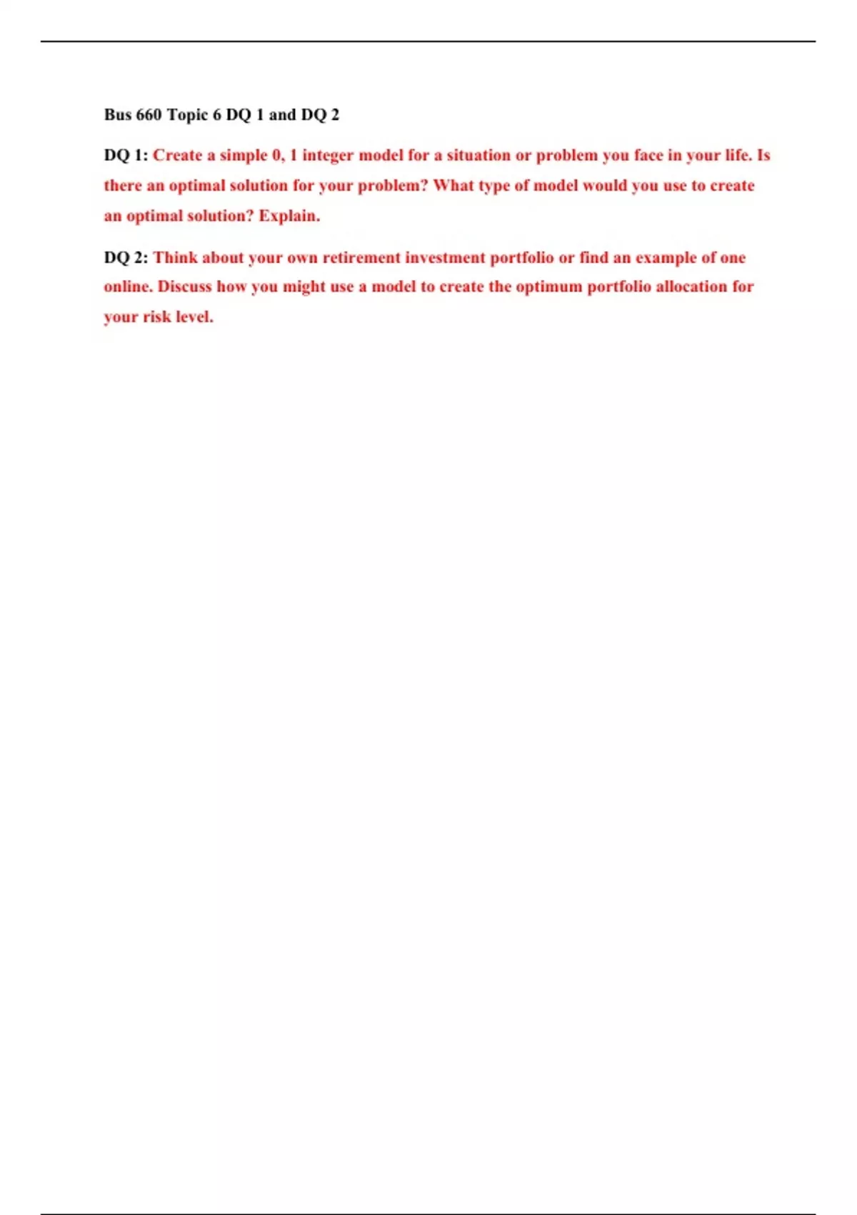 Bus 660 Topic 6 DQ 1 and DQ 2 DQ 1: Create a simple 0, 1 integer model for a situation or problem you face in your life. Is there an optimal solution for your problem? What type of model would you use to create an optimal solution? Explain. DQ 2: Think about your own retirement investment portfolio or find an example of one online. Discuss how you might use a model to create the optimum portfolio allocation for your risk level.