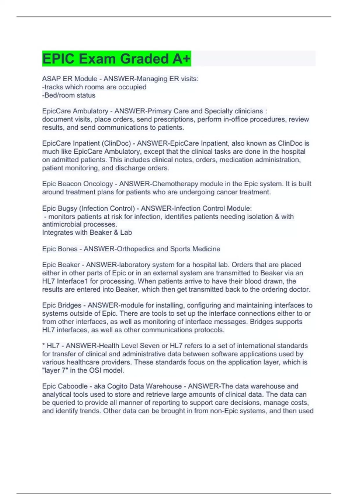 ASAP ER Module - ANSWER-Managing ER visits: -tracks which rooms are occupied -Bed/room status EpicCare Ambulatory - ANSWER-Primary Care and Specialty clinicians : document visits, place orders, send prescriptions, perform in-office procedures, review results, and send communications to patients. EpicCare Inpatient (ClinDoc) - ANSWER-EpicCare Inpatient, also known as ClinDoc is much like EpicCare Ambulatory, except that the clinical tasks are done in the hospital on admitted patients. This includes clinical notes, orders, medication administration, patient monitoring, and discharge orders. Epic Beacon Oncology - ANSWER-Chemotherapy module in the Epic system. It is built around treatment plans for patients who are undergoing cancer treatment. Epic Bugsy (Infection Control) - ANSWER-Infection Control Module: - monitors patients at risk for infection, identifies patients needing isolation & with antimicrobial processes. Integrates with Beaker & Lab Epic Bones - ANSWER-Orthopedics and Sports Medicine Epic Beaker - ANSWER-laboratory system for a hospital lab. Orders that are placed either in other parts of Epic or in an external system are transmitted to Beaker via an HL7 Interface1 for processing. When patients arrive to have their blood drawn, the results are entered into Beaker, which then get transmitted back to the ordering doctor. Epic Bridges - ANSWER-module for installing, configuring and maintaining interfaces to systems outside of Epic. There are tools to set up the interface connections either to or from other interfaces, as well as monitoring of interface messages. Bridges supports HL7 interfaces, as well as other communications protocols. * HL7 - ANSWER-Health Level Seven or HL7 refers to a set of international standards for transfer of clinical and administrative data between software applications used by various healthcare providers. These standards focus on the application layer, which is "layer 7" in the OSI model. Epic Caboodle - aka Cogito Data Warehouse - ANSWER-The data warehouse and analytical tools used to store and retrieve large amounts of clinical data. The data can be queried to provide all manner of reporting to support care decisions, manage costs, and identify trends. Other data can be brought in from non-Epic systems, and then used