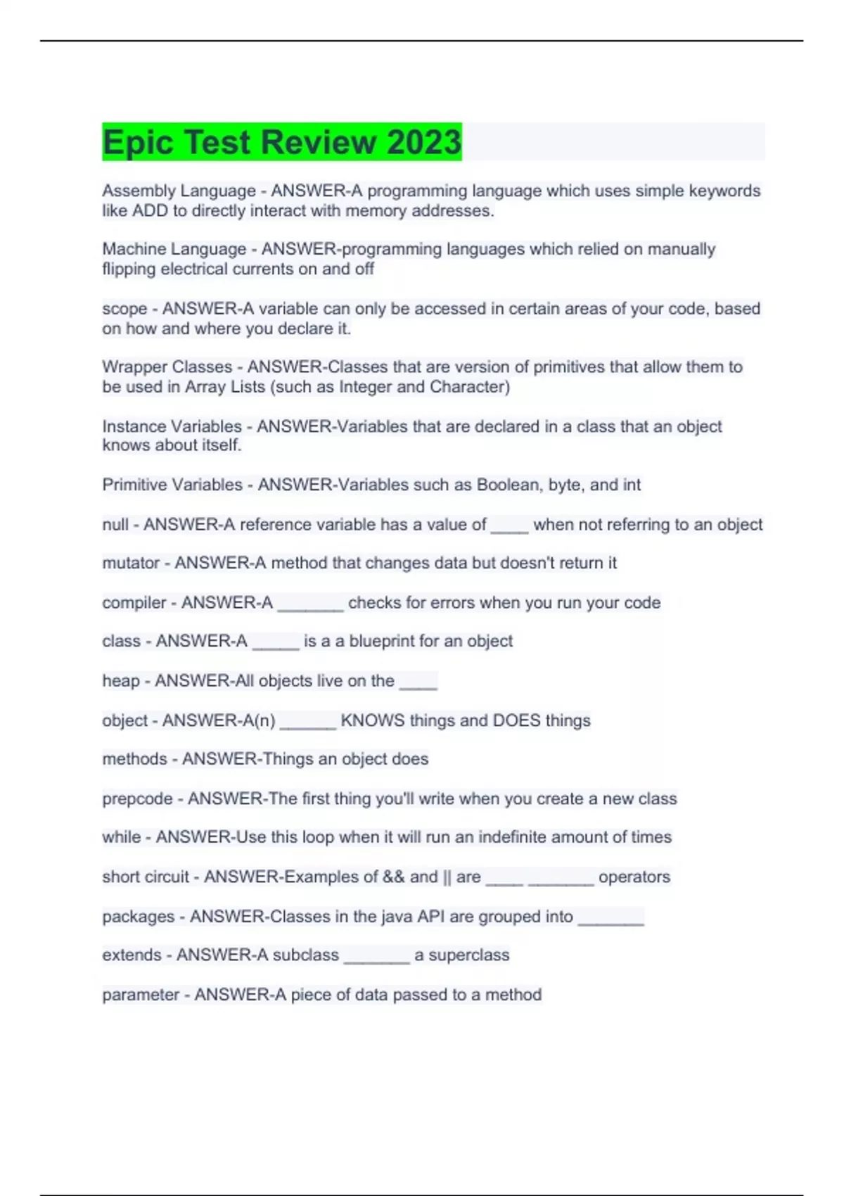 Assembly Language - ANSWER-A programming language which uses simple keywords like ADD to directly interact with memory addresses. Machine Language - ANSWER-programming languages which relied on manually flipping electrical currents on and off scope - ANSWER-A variable can only be accessed in certain areas of your code, based on how and where you declare it. Wrapper Classes - ANSWER-Classes that are version of primitives that allow them to be used in Array Lists (such as Integer and Character) Instance Variables - ANSWER-Variables that are declared in a class that an object knows about itself. Primitive Variables - ANSWER-Variables such as Boolean, byte, and int null - ANSWER-A reference variable has a value of ____ when not referring to an object mutator - ANSWER-A method that changes data but doesn't return it compiler - ANSWER-A _______ checks for errors when you run your code class - ANSWER-A _____ is a a blueprint for an object heap - ANSWER-All objects live on the ____ object - ANSWER-A(n) ______ KNOWS things and DOES things methods - ANSWER-Things an object does prepcode - ANSWER-The first thing you'll write when you create a new class while - ANSWER-Use this loop when it will run an indefinite amount of times short circuit - ANSWER-Examples of && and || are ____ _______ operators packages - ANSWER-Classes in the java API are grouped into _______ extends - ANSWER-A subclass _______ a superclass parameter - ANSWER-A piece of data passed to a method