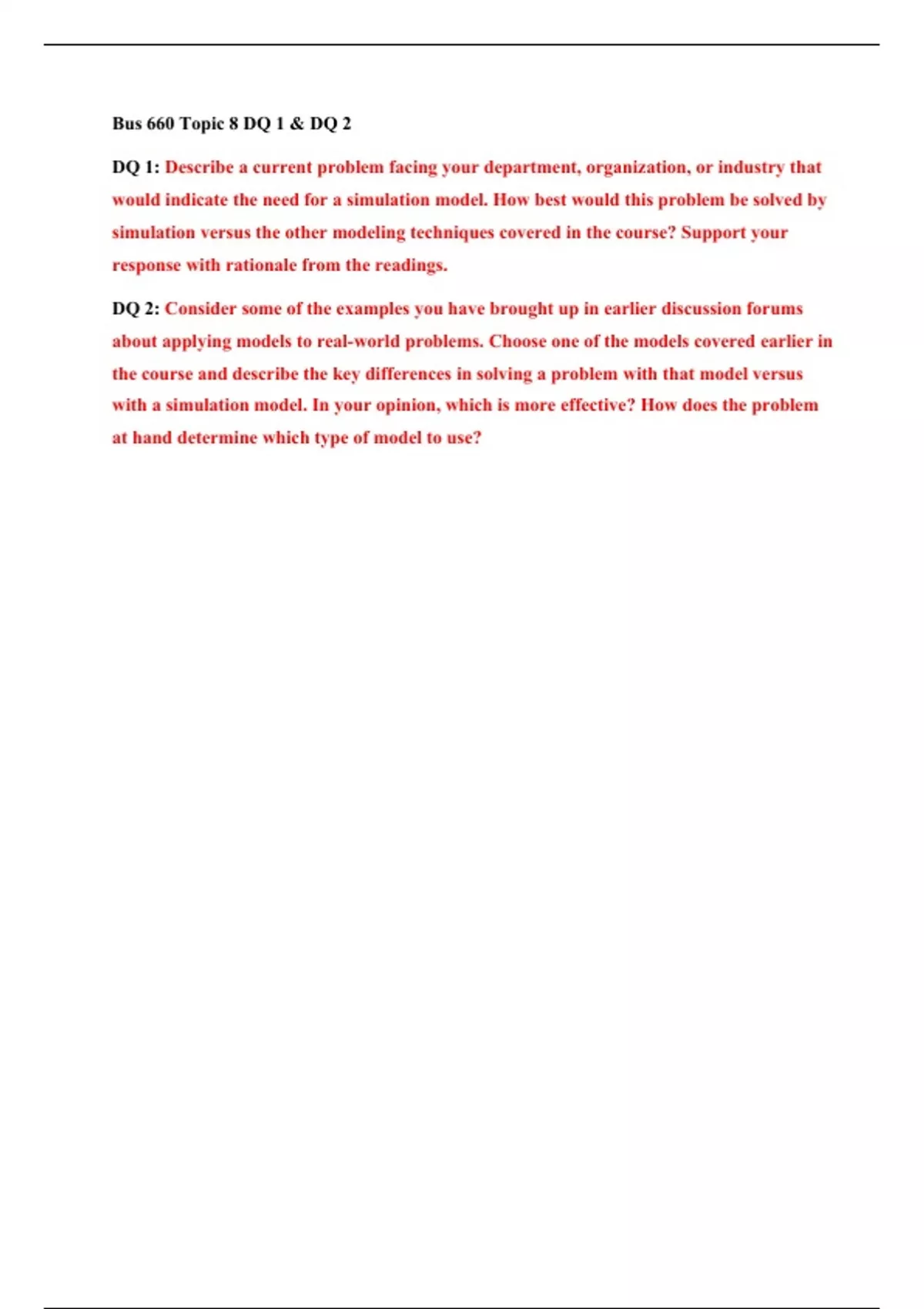 Bus 660 Topic 8 DQ 1 & DQ 2 DQ 1: Describe a current problem facing your department, organization, or industry that would indicate the need for a simulation model. How best would this problem be solved by simulation versus the other modeling techniques covered in the course? Support your response with rationale from the readings. DQ 2: Consider some of the examples you have brought up in earlier discussion forums about applying models to real-world problems. Choose one of the models covered earlier in the course and describe the key differences in solving a problem with that model versus with a simulation model. In your opinion, which is more effective? How does the problem at hand determine which type of model to use?