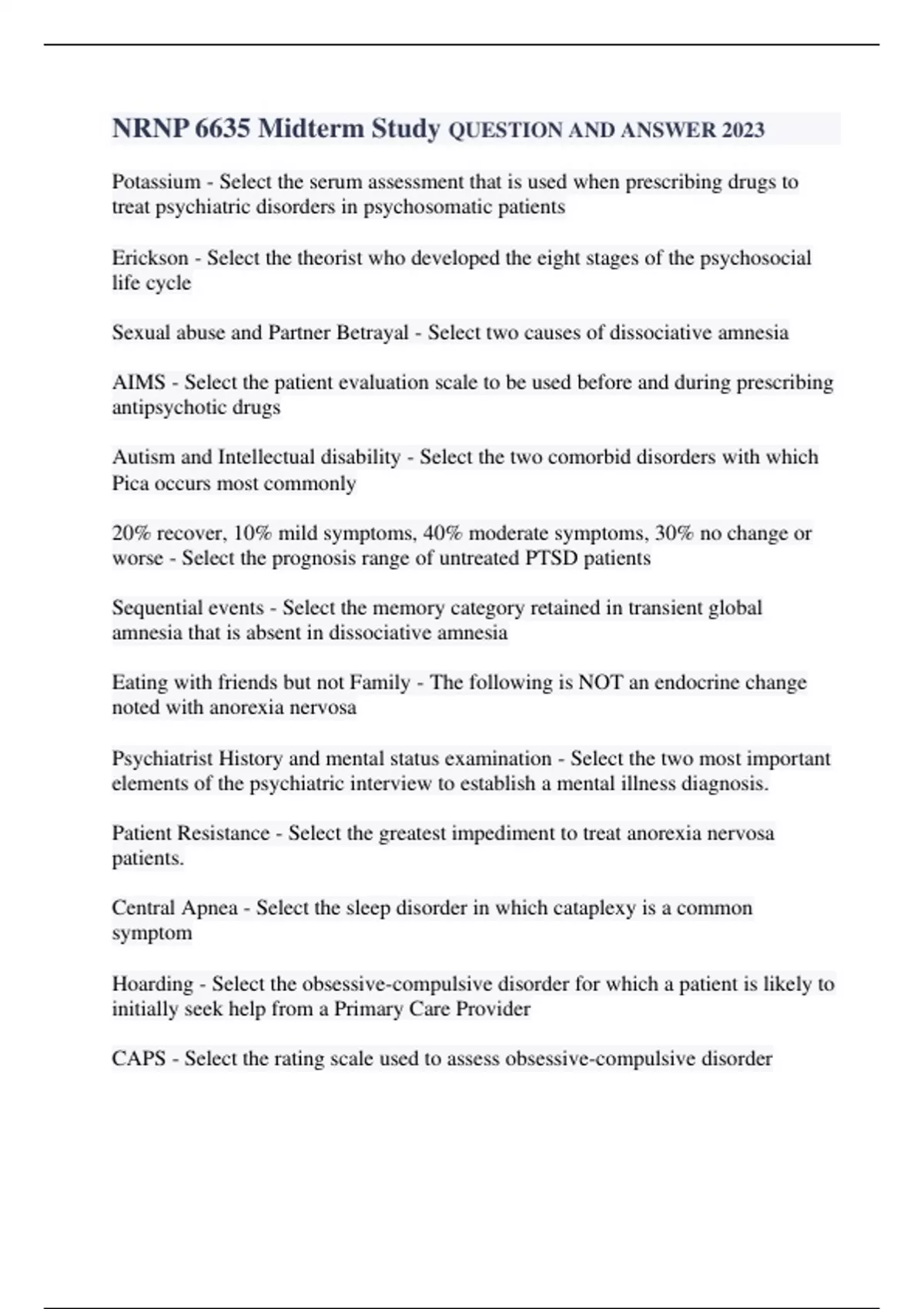 Potassium - Select the serum assessment that is used when prescribing drugs to treat psychiatric disorders in psychosomatic patients Erickson - Select the theorist who developed the eight stages of the psychosocial life cycle Sexual abuse and Partner Betrayal - Select two causes of dissociative amnesia AIMS - Select the patient evaluation scale to be used before and during prescribing antipsychotic drugs Autism and Intellectual disability - Select the two comorbid disorders with which Pica occurs most commonly 20% recover, 10% mild symptoms, 40% moderate symptoms, 30% no change or worse - Select the prognosis range of untreated PTSD patients Sequential events - Select the memory category retained in transient global amnesia that is absent in dissociative amnesia Eating with friends but not Family - The following is NOT an endocrine change noted with anorexia nervosa Psychiatrist History and mental status examination - Select the two most important elements of the psychiatric interview to establish a mental illness diagnosis. Patient Resistance - Select the greatest impediment to treat anorexia nervosa patients. Central Apnea - Select the sleep disorder in which cataplexy is a common symptom Hoarding - Select the obsessive-compulsive disorder for which a patient is likely to initially seek help from a Primary Care Provider CAPS - Select the rating scale used to assess obsessive-compulsive disorder