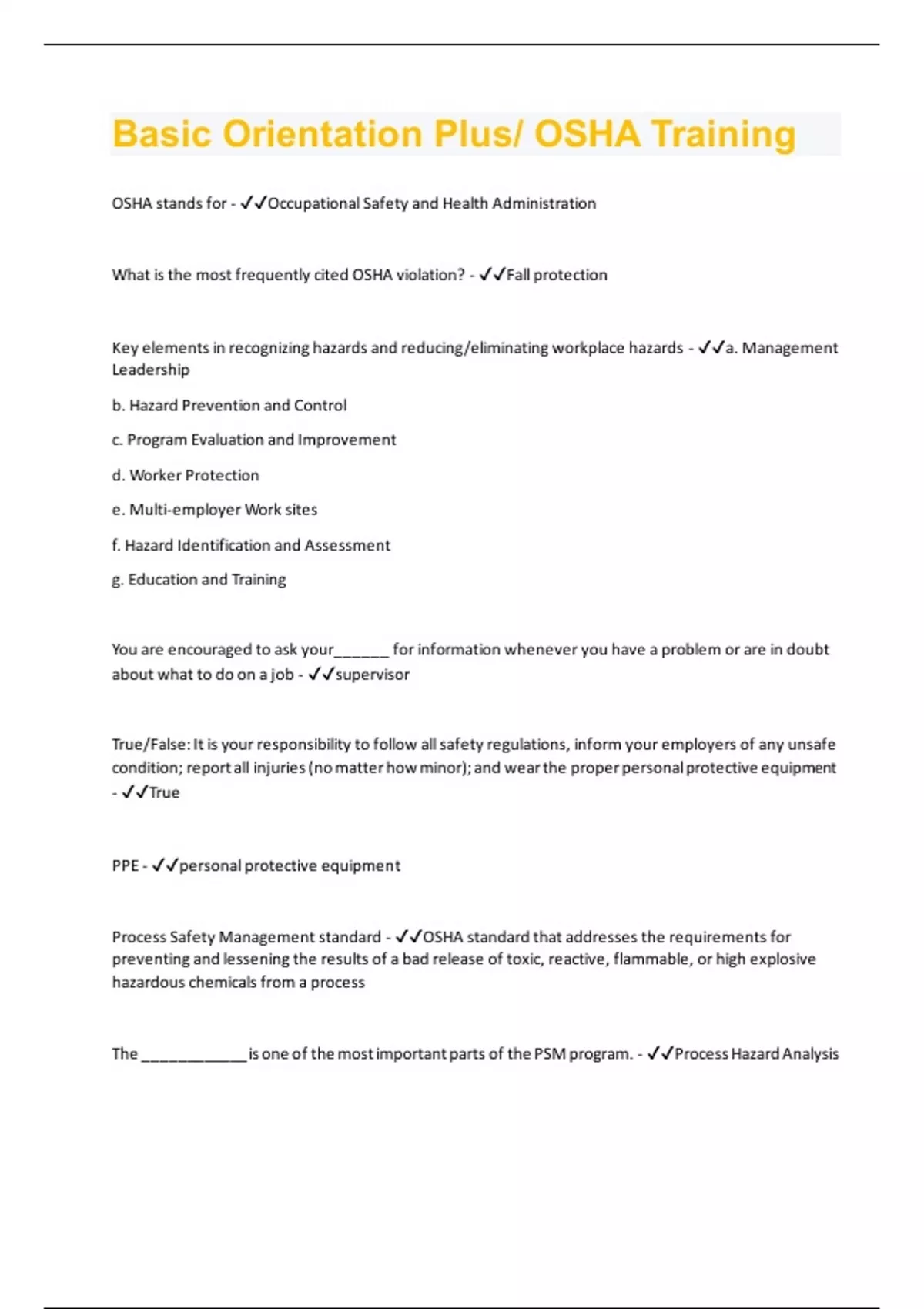 OSHA stands for - Occupational Safety and Health Administration What is the most frequently cited OSHA violation? - Fall protection Key elements in recognizing hazards and reducing/eliminating workplace hazards - a. Management Leadership b. Hazard Prevention and Control c. Program Evaluation and Improvement d. Worker Protection e. Multi-employer Work sites f. Hazard Identification and Assessment g. Education and Training You are encouraged to ask your______ for information whenever you have a problem or are in doubt about what to do on a job - supervisor True/False: It is your responsibility to follow all safety regulations, inform your employers of any unsafe condition; report all injuries (no matter how minor); and wear the proper personal protective equipment - True PPE - personal protective equipment Process Safety Management standard - OSHA standard that addresses the requirements for preventing and lessening the results of a bad release of toxic, reactive, flammable, or high explosive hazardous chemicals from a process The ____________ is one of the most important parts of the PSM program. - Process Hazard AnalysisPHAs are used to identify and evaluate major processes and ensure they are: - a. identified b. evaluated c. Controlled True/False: In the PSM standard, OSHA states employees must be trained if they work with highly hazardous chemicals - True True/False: Facilities are not permitted to control your entrance and exit in covered process areas. - False