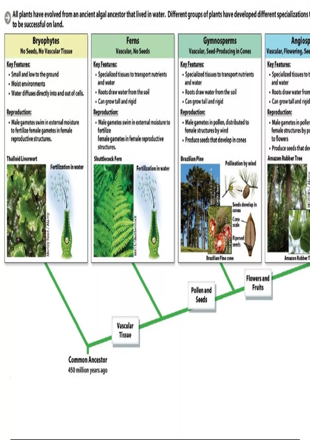 Demonstrates the developmental specializations of bryophytes, ferns, gymnosperms, and angiosperms