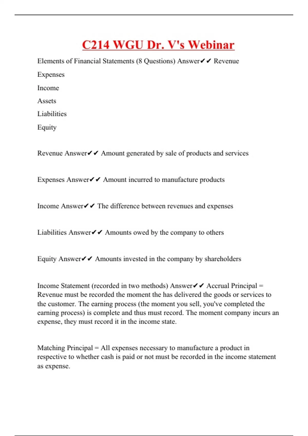 Elements of Financial Statements (8 Questions) Answer Revenue Expenses Income Assets Liabilities Equity Revenue Answer Amount generated by sale of products and services Expenses Answer Amount incurred to manufacture products Income Answer The difference between revenues and expenses Liabilities Answer Amounts owed by the company to others Equity Answer Amounts invested in the company by shareholders Income Statement (recorded in two methods) Answer Accrual Principal = Revenue must be recorded the moment the has delivered the goods or services to the customer. The earning process (the moment you sell, you've completed the earning process) is complete and thus must record. The moment company incurs an expense, they must record it in the income state. Matching Principal = All expenses necessa