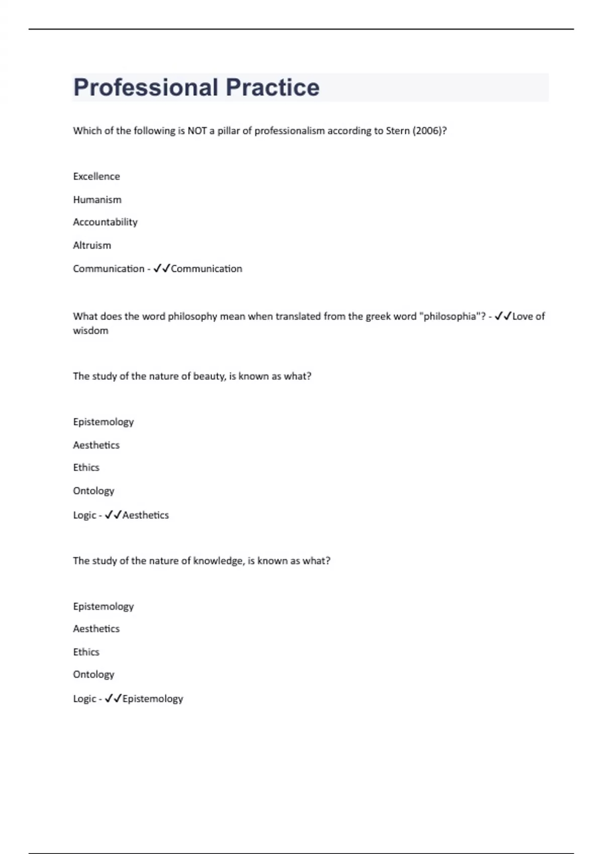 Which of the following is NOT a pillar of professionalism according to Stern (2006)? Excellence Humanism Accountability Altruism Communication - Communication What does the word philosophy mean when translated from the greek word "philosophia"? - Love of wisdom The study of the nature of beauty, is known as what? Epistemology Aesthetics Ethics Ontology Logic - Aesthetics The study of the nature of knowledge, is known as what? Epistemology Aesthetics Ethics Ontology Logic - Epistemology