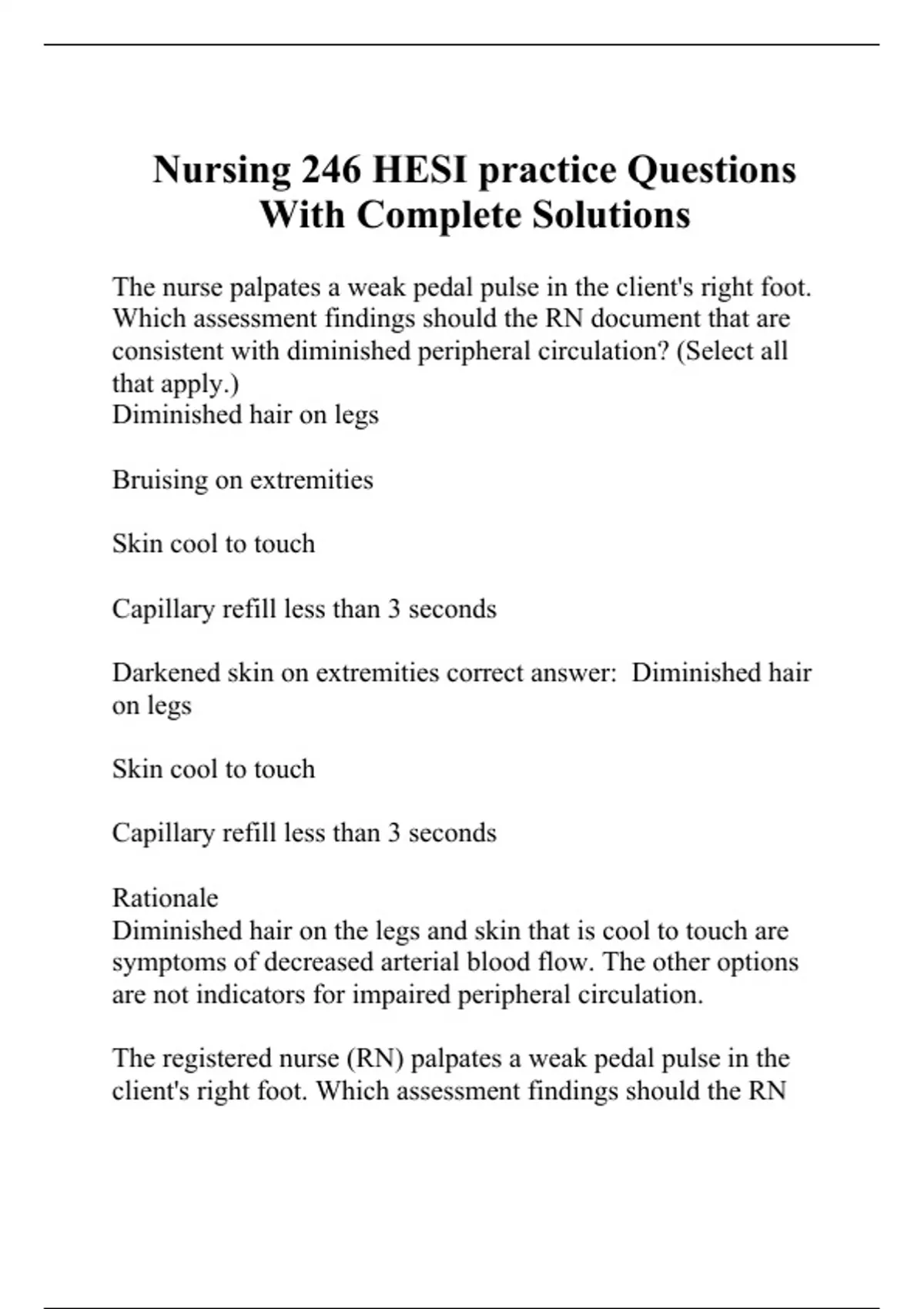 The nurse palpates a weak pedal pulse in the client's right foot. Which assessment findings should the RN document that are consistent with diminished peripheral circulation? (Select all that apply.) Diminished hair on legs Bruising on extremities Skin cool to touch Capillary refill less than 3 seconds Darkened skin on extremities correct answer: Diminished hair on legs Skin cool to touch Capillary refill less than 3 seconds Rationale Diminished hair on the legs and skin that is cool to touch are symptoms of decreased arterial blood flow. The other options are not indicators for impaired peripheral circulation. The registered nurse (RN) palpates a weak pedal pulse in the client's right foot. Which assessment findings should the RN document that are consistent with diminished peripheral circulation? (Select all that apply.) Diminished hair on legs. Bruising on extremities. Skin cool to touch. Capillary refill less than 3 seconds. Darkened skin on extremities. correct answer: Skin cool to touch. Capillary refill less than 3 seconds. Rationale Diminished hair on the legs and skin that is cool to touch are expectant signs of decreased arterial blood flow. The registered nurse (RN) is caring for a client who has a closed head injury from a motor vehicle collision. Which finding should the RN assess the client for the risk of diabetes insipidus (DI)? High fever. Low blood pressure. Muscle rigidity.