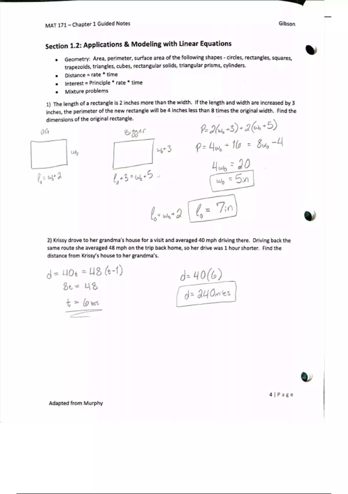 Summary Precalculus 1.2– Applications & Modeling with Linear Equations (MAT 171)