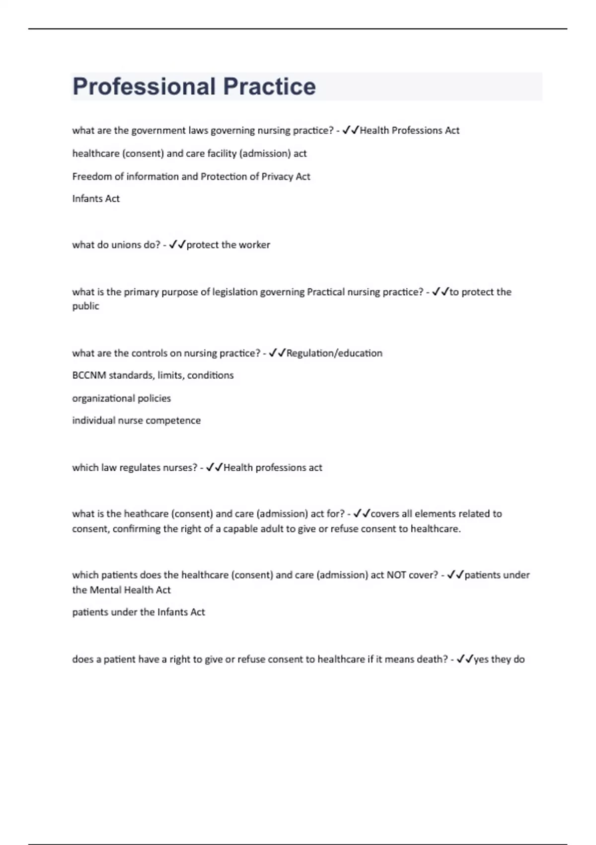 what are the government laws governing nursing practice? - Health Professions Act healthcare (consent) and care facility (admission) act Freedom of information and Protection of Privacy Act Infants Act what do unions do? - protect the worker what is the primary purpose of legislation governing Practical nursing practice? - to protect the public what are the controls on nursing practice? - Regulation/education BCCNM standards, limits, conditions organizational policies individual nurse competence which law regulates nurses? - Health professions act what is the heathcare (consent) and care (admission) act for? - covers all elements related to consent, confirming the right of a capable adult to give or refuse consent to healthcare. which patients does the healthcare (consent) and care (admission) act NOT cover? - patients under the Mental Health Act patients under the Infants Act does a patient have a right to give or refuse consent to healthcare if it means death? - yes they do