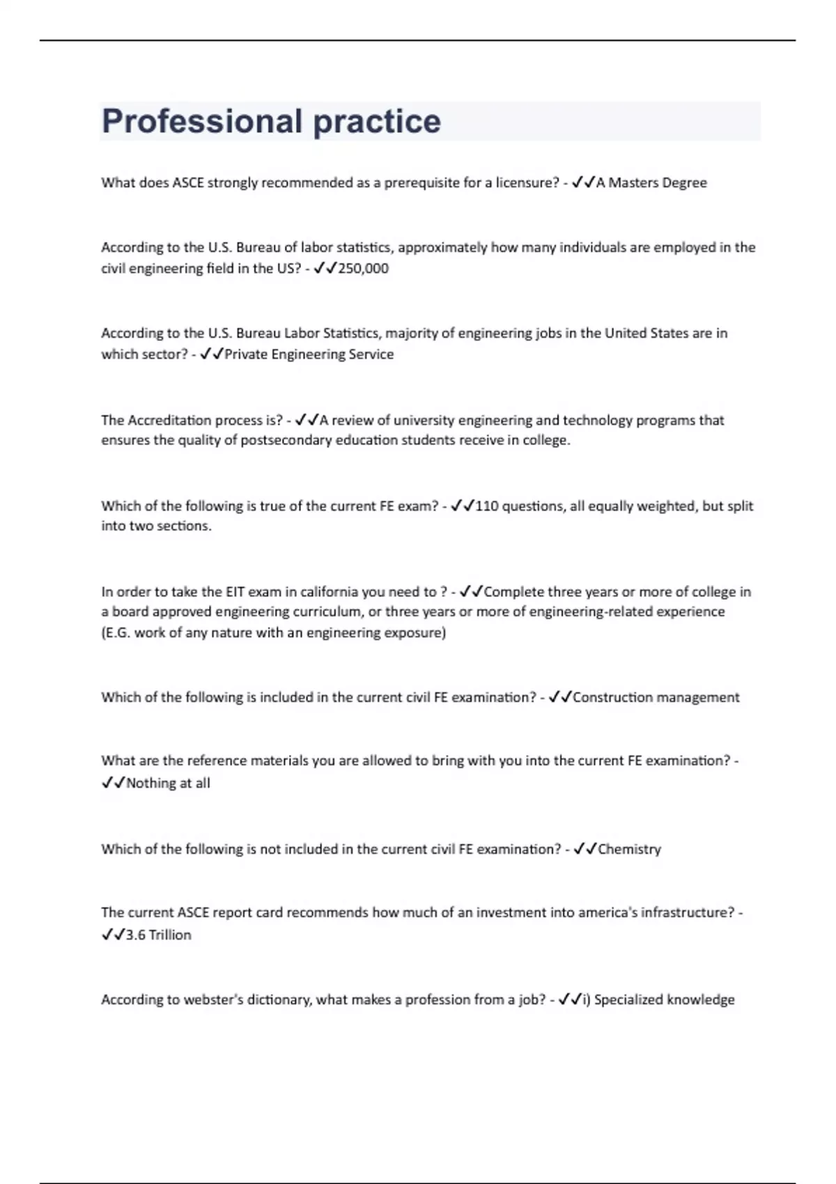 What does ASCE strongly recommended as a prerequisite for a licensure? - A Masters Degree According to the U.S. Bureau of labor statistics, approximately how many individuals are employed in the civil engineering field in the US? - 250,000 According to the U.S. Bureau Labor Statistics, majority of engineering jobs in the United States are in which sector? - Private Engineering Service The Accreditation process is? - A review of university engineering and technology programs that ensures the quality of postsecondary education students receive in college. Which of the following is true of the current FE exam? - 110 questions, all equally weighted, but split into two sections. In order to take the EIT exam in california you need to ? - Complete three years or more of college in a board approved engineering curriculum, or three years or more of engineering-related experience (E.G. work of any nature with an engineering exposure) Which of the following is included in the current civil FE examination? - Construction management What are the reference materials you are allowed to bring with you into the current FE examination? - Nothing at all Which of the following is not included in the current civil FE examination? - Chemistry The current ASCE report card recommends how much of an investment into america's infrastructure? - 3.6 Trillion According to webster's dictionary, what makes a profession from a job? - i) Specialized knowledge