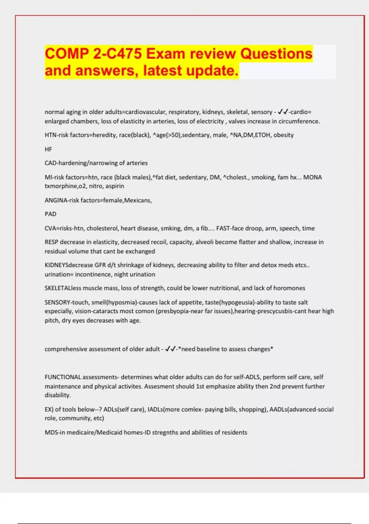 COMP 2-C475 Exam review Questions and answers, latest update. normal aging in older adults=cardiovascular, respiratory, kidneys, skeletal, sensory - -cardio= enlarged chambers, loss of elasticity in arteries, loss of electricity , valves increase in circumference. HTN-risk factors=heredity, race(black), ^age(>50),sedentary, male, ^NA,DM,ETOH, obesity HF CAD-hardening/narrowing of arteries MI-risk factors=htn, race (black males),^fat diet, sedentary, DM, ^cholest., smoking, fam hx... MONA txmorphine,o2, nitro, aspirin ANGINA-risk factors=female,Mexicans, PAD CVA=risks-htn, cholesterol, heart disease, smking, dm, a fib.... FAST-face droop, arm, speech, time RESP decrease in elasticity, decreased recoil, capacity, alveoli become flatter and shallow, increase in residual volume that cant be exchanged KIDNEYSdecrease GFR d/t shrinkage of kidneys, decreasing ability to filter and detox meds etcs.. urination= incontinence, night urination SKELETALless muscle mass, loss of strength, could be lower nutritional, and lack of horomones SENSORY-touch, smell(hyposmia)-causes lack of appetite, taste(hypogeusia)-ability to taste salt especially, vision-cataracts most comon (presbyopia-near far issues),hearing-prescycusbis-cant hear high pitch, dry eyes decreases with age. comprehensive assessment of older adult - -*need baseline to assess changes*