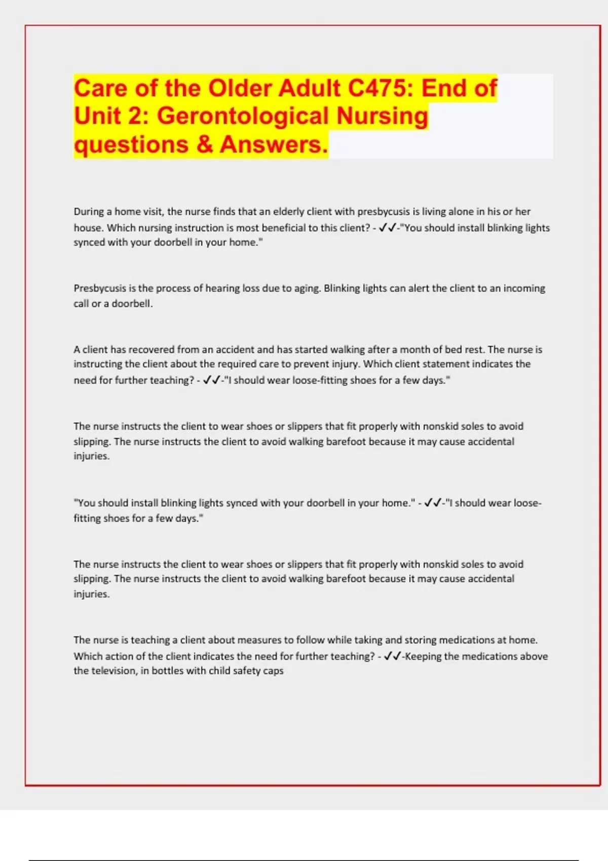 Care of the Older Adult C475: End of Unit 2: Gerontological Nursing questions & Answers. During a home visit, the nurse finds that an elderly client with presbycusis is living alone in his or her house. Which nursing instruction is most beneficial to this client? - -"You should install blinking lights synced with your doorbell in your home." Presbycusis is the process of hearing loss due to aging. Blinking lights can alert the client to an incoming call or a doorbell. A client has recovered from an accident and has started walking after a month of bed rest. The nurse is instructing the client about the required care to prevent injury. Which client statement indicates the need for further teaching? - -"I should wear loose-fitting shoes for a few days." The nurse instructs the client to wear shoes or slippers that fit properly with nonskid soles to avoid slipping. The nurse instructs the client to avoid walking barefoot because it may cause accidental injuries. "You should install blinking lights synced with your doorbell in your home." - -"I should wear loose-fitting shoes for a few days." The nurse instructs the client to wear shoes or slippers that fit properly with nonskid soles to avoid slipping. The nurse instructs the client to avoid walking barefoot because it may cause accidental injuries. The nurse is teaching a client about measures to follow while taking and storing medications at home. Which action of the client indicates the need for further teaching? - -Keeping the medications above the television, in bottles with child safety caps Child safety caps are not the primary prevention for accidental ingestion of medication. Therefore, the client should not keep the medications within the reach of children. The nurse is preparing to discharge a client with a femur fracture. Which nursing intervention helps to promote the client's safety at home? - -Teaching the client about care guidelines During client teaching, the nurse instructs precautions and care guidelines that help prevent further damage to the client's femur. Therefore, the client teaching helps to promote the client's safety at home. A home nurse is caring for a geriatric client who has been placed in an enclosed bed to prevent falls. The nurse teaches care guidelines to the client's family members to ensure home safety. Which statement of the caregiver indicates the need for further teaching? - -"I should always keep the bed in the high position."