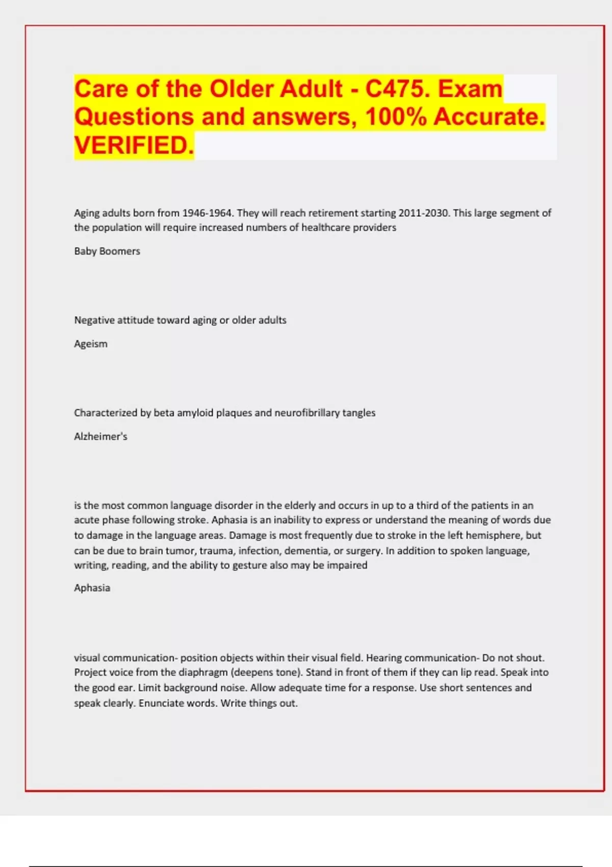 Care of the Older Adult - C475. Exam Questions and answers, 100% Accurate. VERIFIED. Aging adults born from . They will reach retirement starting . This large segment of the population will require increased numbers of healthcare providers Baby Boomers Negative attitude toward aging or older adults Ageism Characterized by beta amyloid plaques and neurofibrillary tangles Alzheimer's is the most common language disorder in the elderly and occurs in up to a third of the patients in an acute phase following stroke. Aphasia is an inability to express or understand the meaning of words due to damage in the language areas. Damage is most frequently due to stroke in the left hemisphere, but can be due to brain tumor, trauma, infection, dementia, or surgery. In addition to spoken language, writing, reading, and the ability to gesture also may be impaired Aphasia visual communication- position objects within their visual field. Hearing communication- Do not shout. Project voice from the diaphragm (deepens tone). Stand in front of them if they can lip read. Speak into the good ear. Limit background noise. Allow adequate time for a response. Use short sentences and speak clearly. Enunciate words. Write things out. Speech Communication-individuals with speech or language difficulties might be more anxious or self-aware. Limit distractions, make eye contact, position yourself in front of the person. Use facial or body language. Use written communication. Use short complete sentences. Summarize message for accuracy. Take your time. Changes of aging that could affect therapeutic communication invite, arrange environment, maximize communication, maximize understanding, and follow through Satir's Basic principles for Communication Refers to all forms of communication that enhance or supplement speech and writing, either, temporarily or permanently. AAC can both enhance (augmentative) and replace (alternative) conventional forms of expression for people who can't communicate through speech, writing, or gestures. AAC (Augmentative and Alternative Communication) Activities of daily living (ADLs): include activities of daily life such as bathing, dressing, transferring, walking, eating, and continence. Instrumental activities of daily living (IADLs): Activities related to independent living, they include meal preparation, money management, shopping, housework, and using a telephone. Nurses can use instruments to identify elderly individuals who benefit from an increased level of care or add support. difference between ADLs and IADLs (instrumental activities of daily living) What is the criterion for the pneumococcal vaccine? Pneumococcal vaccine is given once for clients who are 65 years of age or older. There is evidence to support one-time-only revaccination for clients 75 years or older who have not been vaccinated in 5 or more years. In most cases of elder abuse who is the perpetrator? Most cases of elder abuse are perpetrated by a family member, and reasons for the abuse include caregiver burnout and stress, financial worries, trans-generational violence and psychopathology in the abuser. Women and dependent elders tend to be the most vulnerable to abuse. There are three types of assessments: Physical assessment is assessing the patient's physical health. It included vital signs, assessing for pain, blood pressure problems, irregular heartbeat, abnormal breath sounds, etc. Functional assessment is assessing what the older adult can still for themselves. Bathing, eating, getting dress, brushing their teeth and more are functional abilities. Functional abilities can be altered due to physical impairment and illness. Dr. Katz and Dr. Barthel developed ADL/IADL indexes to measure the patient's functional abilities. Cognitive- thought processing, thinking and reasoning skills.