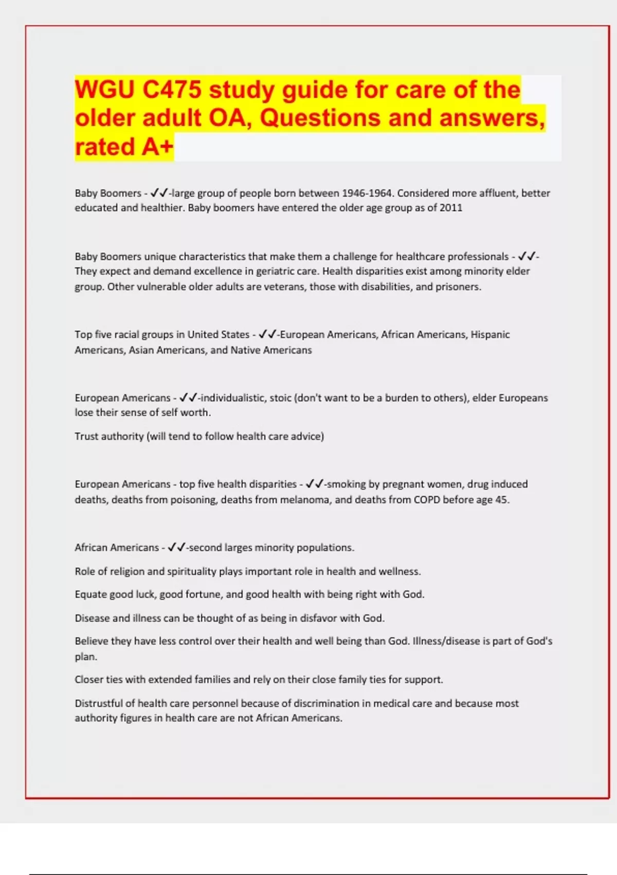 WGU C475 study guide for care of the older adult OA, Questions and answers, rated A+ Baby Boomers - -large group of people born between . Considered more affluent, better educated and healthier. Baby boomers have entered the older age group as of 2011 Baby Boomers unique characteristics that make them a challenge for healthcare professionals - -They expect and demand excellence in geriatric care. Health disparities exist among minority elder group. Other vulnerable older adults are veterans, those with disabilities, and prisoners. Top five racial groups in United States - -European Americans, African Americans, Hispanic Americans, Asian Americans, and Native Americans European Americans - -individualistic, stoic (don't want to be a burden to others), elder Europeans lose their sense of self worth. Trust authority (will tend to follow health care advice) European Americans - top five health disparities - -smoking by pregnant women, drug induced deaths, deaths from poisoning, deaths from melanoma, and deaths from COPD before age 45. African Americans - -second larges minority populations. Role of religion and spirituality plays important role in health and wellness. Equate good luck, good fortune, and good health with being right with God. Disease and illness can be thought of as being in disfavor with God. Believe they have less control over their health and well being than God. Illness/disease is part of God's plan. Closer ties with extended families and rely on their close family ties for support. Distrustful of health care personnel because of discrimination in medical care and because most authority figures in health care are not African Americans. African Americans - top five health disparities - -new cases of gonorrhea, congenital syphilis, new cases of AIDS, and deaths due to HIV infection. The impact of racism has long been considered one of the factors that contribute to decreased longevity and increases of chronic illnesses Hispanic Americans - -high values on family, religion, and community. Emphasize family interdependence over independence. They turn to family first before seeking outside health care. Seek the use of homeopathic remedies in conjunction with religious artifacts before engaging the health care professional. They disagree with is silence and noncompliance. May not seek health care because they