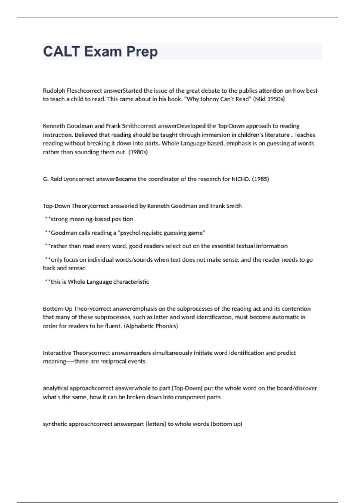 Rudolph Flesch Started the issue of the great debate to the publics attention on how best to teach a child to read. This came about in his book. "Why Johnny Can't Read" (Mid 1950s) Kenneth Goodman and Frank Smith Developed the Top-Down approach to reading instruction. Believed that reading should be taught through immersion in children's literature . Teaches reading without breaking it down into parts. Whole Language based, emphasis is on guessing at words rather than sounding them out. (1980s) G. Reid Lyon Became the coordinator of the research for NICHD. (1985) Top-Down Theory led by Kenneth Goodman and Frank Smith **strong meaning-based position **Goodman calls reading a "psycholinguistic guessing game" **rather than read every word, good readers select out on the essential textual information **only focus on individual words/sounds when text does not make sense, and the reader needs to go back and reread **this is Whole Language characteristic Bottom-Up Theory emphasis on the subprocesses of the reading act and its contention that many of these subprocesses, such as letter and word identification, must become automatic in order for readers to be fluent. (Alphabetic Phonics) Interactive Theory readers simultaneously initiate word identification and predict meaning----these are reciprocal events analytical approach whole to part (Top-Down) put the whole word on the board/discover what's the same, how it can be broken down into component parts synthetic approach part (letters) to whole words (bottom up) linguistics-based beginning reading approach Learning to recognize word families (bat, cat, hat, ) D. Berlin (1887) Coined the term "dys" -- meaning difficult, "lexia" -- meaning pertaining to words. James Hinshelwood (1917) "word blindness" -- ophthalmologist from Scotland that discovered that the left hemisphere of the brain affected word storage Samuel Orton () Neuropsychiatrist from Columbia University in New York who first recognized dyslexia students in America. He discovered that approximately 10% of students will not learn using the whole words method. Also coined the term "strephosymbolia" (twisted words), which replaced the former term word blindness. Dr. Madonald Critchley (1964) Established term "developmental dyslexia" at the World Federation of Neurology meeting at the Scottish Rite Hospital. Marianne Frosig (1960) Did visual tracking research. Findings show there is no relationship between dyslexia and vision acuity. Isabelle Liberman () Did research on phonological awareness that linguistic information is stored in its phonological form (all word recognition requires letter-sound access). Also studied phonological processing deficits affecting the ability to make use of letter-sound associations as an effect of rapid retrieval problems. Discovered tapping exercises.