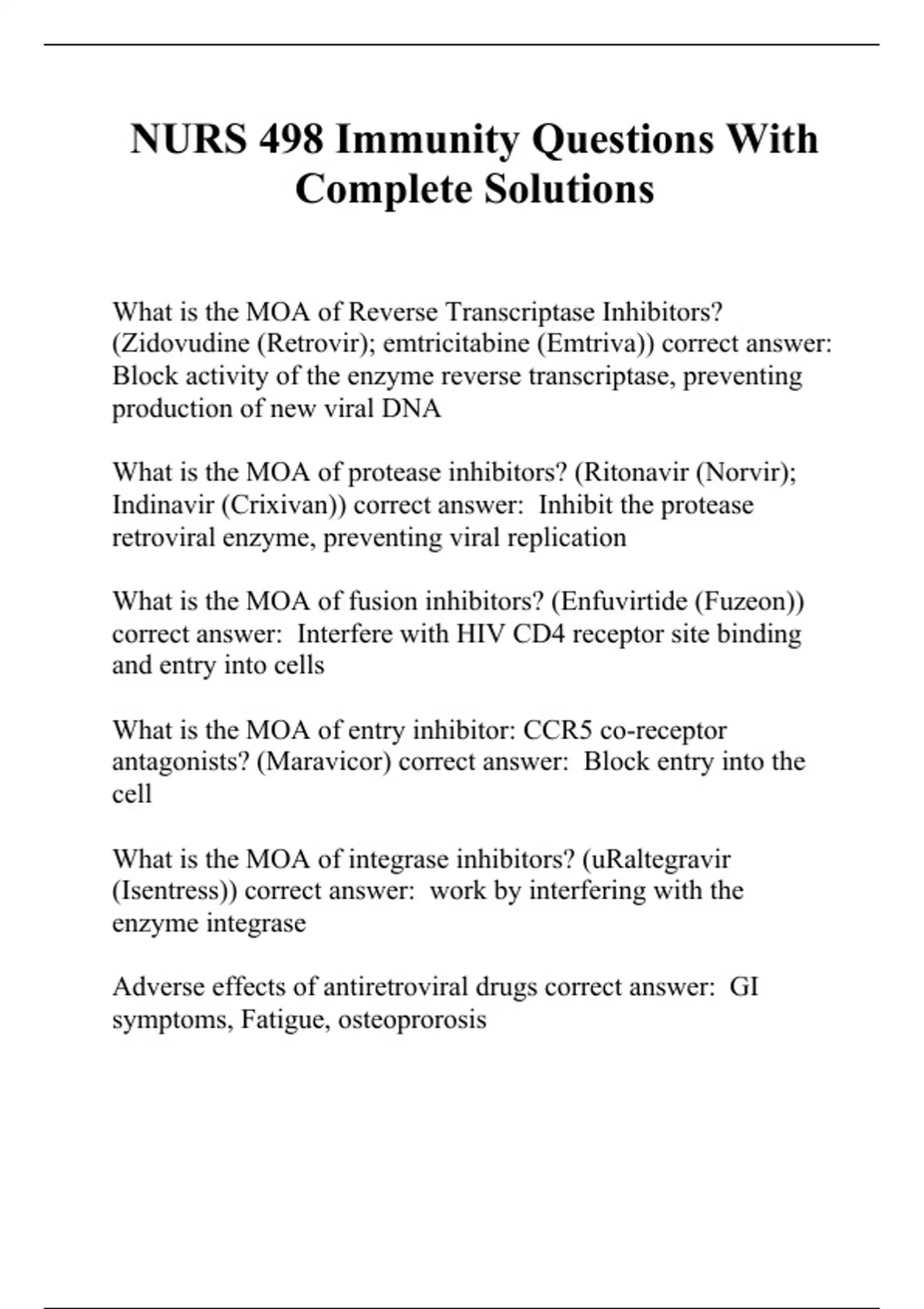 What is the MOA of Reverse Transcriptase Inhibitors? (Zidovudine (Retrovir); emtricitabine (Emtriva)) correct answer: Block activity of the enzyme reverse transcriptase, preventing production of new viral DNA What is the MOA of protease inhibitors? (Ritonavir (Norvir); Indinavir (Crixivan)) correct answer: Inhibit the protease retroviral enzyme, preventing viral replication What is the MOA of fusion inhibitors? (Enfuvirtide (Fuzeon)) correct answer: Interfere with HIV CD4 receptor site binding and entry into cells What is the MOA of entry inhibitor: CCR5 co-receptor antagonists? (Maravicor) correct answer: Block entry into the cell What is the MOA of integrase inhibitors? (uRaltegravir (Isentress)) correct answer: work by interfering with the enzyme integrase Adverse effects of antiretroviral drugs correct answer: GI symptoms, Fatigue, osteoprorosis Chemical Categories of NSAIDs - Which meds are Salicylates? correct answer: acetylsalicylic acid (ASA) diflunisal (Apo-Diflunisal) Celecoxib (celebrex) is what chemical category of NSAIDs correct answer: Cyclooxygenase-2 (COX-2) inhibitors What meds are propionic acids correct answer: -ibuprofen (Advil, Motrin) -naproxen (Naprosyn E) -naproxen sodium (Aleve, Anaprox) What chemical category of NSAIDs do these meds belong to •diclofenac potassium (Voltaren Rapide) •diclofenac sodium (Voltaren) •sodium indomethacin (Indocin) •ketorolac tromethamine (Toradol) •Mefenamic acid (Ponstan) correct answer: Acetic acid derivatives