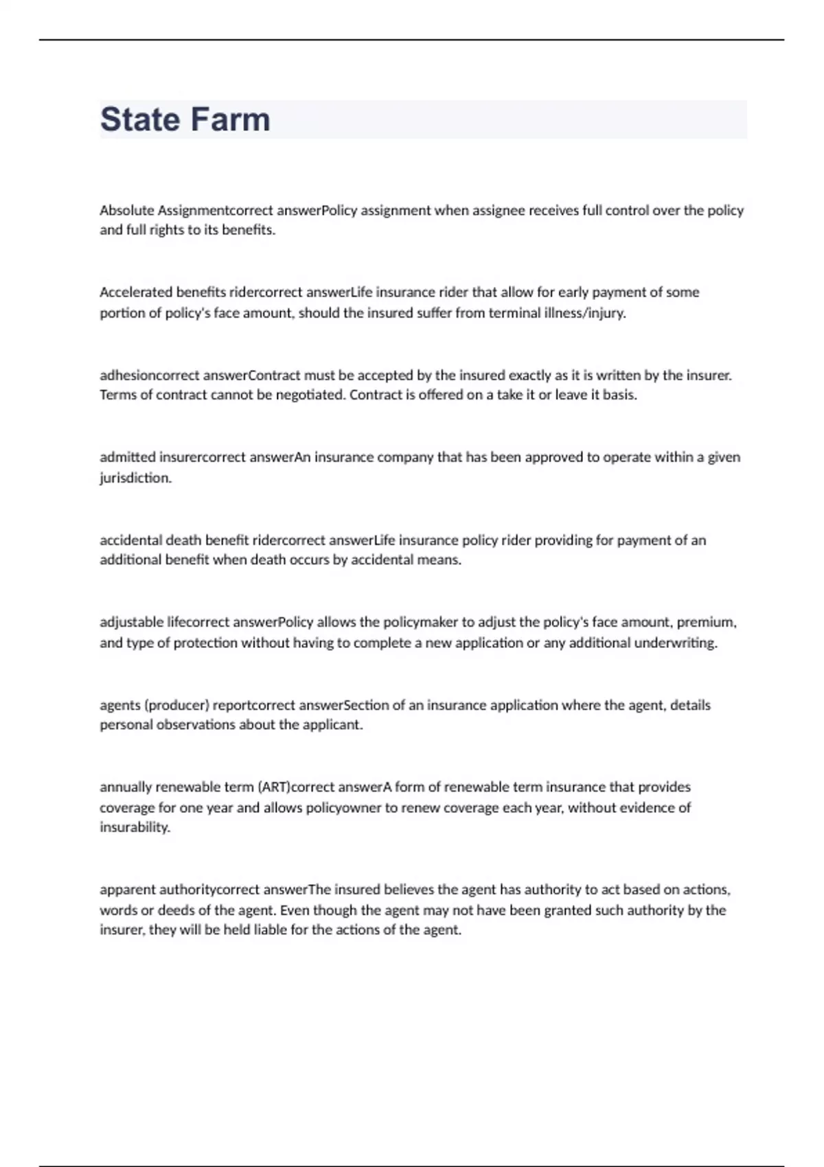 Absolute Assignment Policy assignment when assignee receives full control over the policy and full rights to its benefits. Accelerated benefits rider Life insurance rider that allow for early payment of some portion of policy's face amount, should the insured suffer from terminal illness/injury. adhesion Contract must be accepted by the insured exactly as it is written by the insurer. Terms of contract cannot be negotiated. Contract is offered on a take it or leave it basis. admitted insurer An insurance company that has been approved to operate within a given jurisdiction. accidental death benefit rider Life insurance policy rider providing for payment of an additional benefit when death occurs by accidental means. adjustable life Policy allows the policymaker to adjust the policy's face amount, premium, and type of protection without having to complete a new application or any additional underwriting. agents (producer) report Section of an insurance application where the agent, details personal observations about the applicant. annually renewable term (ART) A form of renewable term insurance that provides coverage for one year and allows policyowner to renew coverage each year, without evidence of insurability. apparent authority The insured believes the agent has authority to act based on actions, words or deeds of the agent. Even though the agent may not have been granted such authority by the insurer, they will be held liable for the actions of the agent. automatic premium loan provision Authorizes the insurer to automatically pay any premium in default at the end of the grace period. The premium owed plus interest charged is deducted from the policy's cash value. beneficiary Person to whom the proceeds of a life or accident policy are payable when the insured dies. annuitant One to whom an annuity is payable, or a person upon the continuance of whose life further payment depends. attained age With reference to an insured, the current insurance age. aviation exclusion The insurer will not pay a claim if the insured dies as a result of flying an aircraft or acting as a member of a flight crew. In most cases, the insurer will offer the applicant the opportunity to purchase a rider offsetting the exclusion. buyers guide A generic publication that explains life insurance in a way that an average consumer can understand. It does not contain specific product or policy information Buy-sell agreement Agreement that a deceased businessowner's interest will be sold and purchased at a predetermined price or at a price according to a predetermined formula. Churning Replacing one life contract with another within the same company without demonstrating a benefit to the client. common disaster provision This policy provision provides an alternative beneficiary in the event that the insured and the original beneficiary die as the result of a common accident. Consideration Element of a legal contract consisting of premium payment and statements made by the prospective insured in the application. Cash Value The equity amount or savings accumulation in a permanent life policy. Collateral assignment Assignment of a policy to a creditor as a security for a debt. At the insured death, the creditor is entitled to be reimbursed out of policy proceeds for the amount owed and any excess will go to the beneficiary.