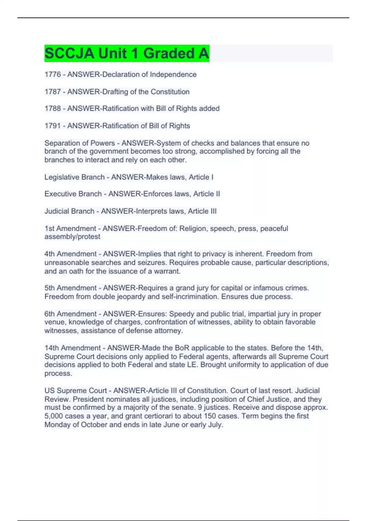 1776 - ANSWER-Declaration of Independence 1787 - ANSWER-Drafting of the Constitution 1788 - ANSWER-Ratification with Bill of Rights added 1791 - ANSWER-Ratification of Bill of Rights Separation of Powers - ANSWER-System of checks and balances that ensure no branch of the government becomes too strong, accomplished by forcing all the branches to interact and rely on each other. Legislative Branch - ANSWER-Makes laws, Article I Executive Branch - ANSWER-Enforces laws, Article II Judicial Branch - ANSWER-Interprets laws, Article III 1st Amendment - ANSWER-Freedom of: Religion, speech, press, peaceful assembly/protest 4th Amendment - ANSWER-Implies that right to privacy is inherent. Freedom from unreasonable searches and seizures. Requires probable cause, particular descriptions, and an oath for the issuance of a warrant. 5th Amendment - ANSWER-Requires a grand jury for capital or infamous crimes. Freedom from double jeopardy and self-incrimination. Ensures due process. 6th Amendment - ANSWER-Ensures: Speedy and public trial, impartial jury in proper venue, knowledge of charges, confrontation of witnesses, ability to obtain favorable witnesses, assistance of defense attorney. 14th Amendment - ANSWER-Made the BoR applicable to the states. Before the 14th, Supreme Court decisions only applied to Federal agents, afterwards all Supreme Court decisions applied to both Federal and state LE. Brought uniformity to application of due process. US Supreme Court - ANSWER-Article III of Constitution. Court of last resort. Judicial Review. President nominates all justices, including position of Chief Justice, and they must be confirmed by a majority of the senate. 9 justices. Receive and dispose approx. 5,000 cases a year, and grant certiorari to about 150 cases. Term begins the first Monday of October and ends in late June or early July.