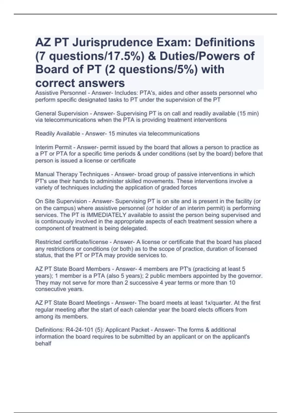 AZ PT Jurisprudence Exam: Definitions (7 questions/17.5%) & Duties/Powers of Board of PT (2 questions/5%) with correct answers