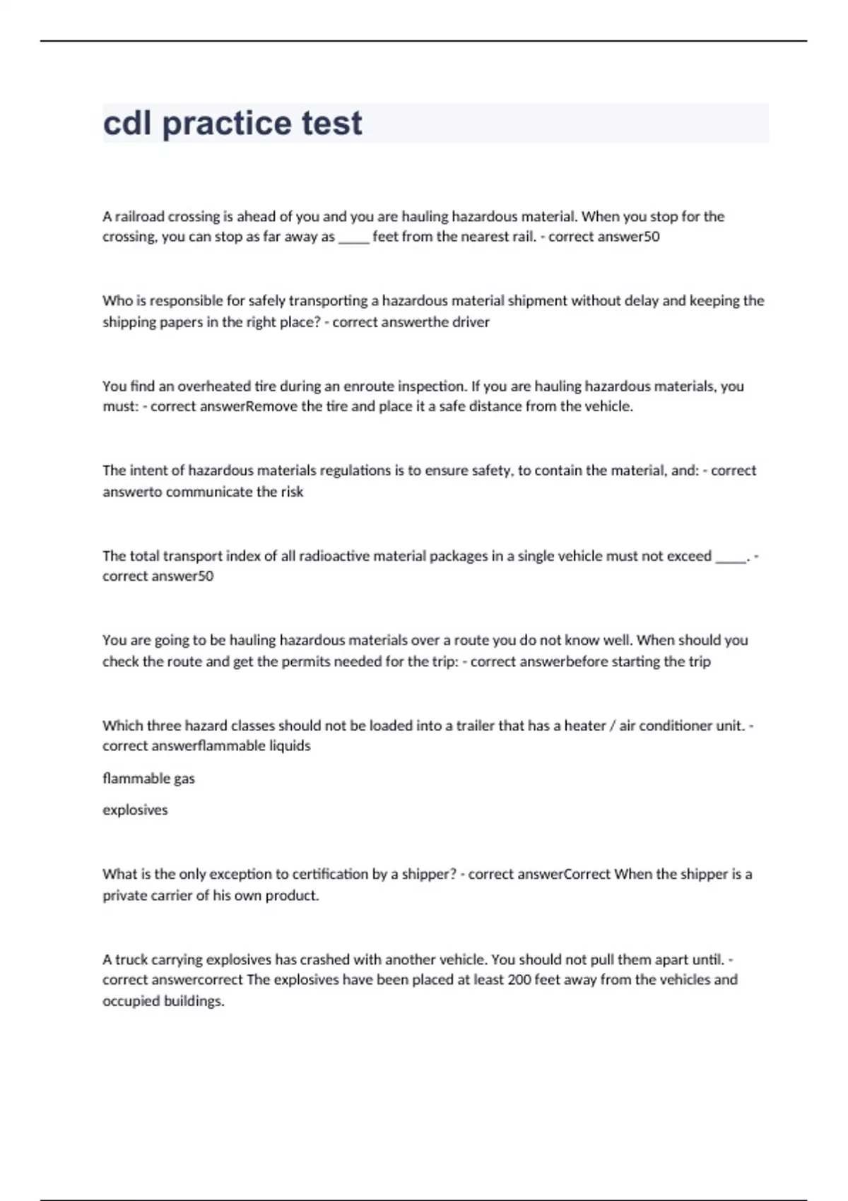 A railroad crossing is ahead of you and you are hauling hazardous material. When you stop for the crossing, you can stop as far away as ____ feet from the nearest rail. - correct answer50 Who is responsible for safely transporting a hazardous material shipment without delay and keeping the shipping papers in the right place? - correct answerthe driver You find an overheated tire during an enroute inspection. If you are hauling hazardous materials, you must: - correct answerRemove the tire and place it a safe distance from the vehicle. The intent of hazardous materials regulations is to ensure safety, to contain the material, and: - correct answerto communicate the risk The total transport index of all radioactive material packages in a single vehicle must not exceed ____. - correct answer50 You are going to be hauling hazardous materials over a route you do not know well. When should you check the route and get the permits needed for the trip: - correct answerbefore starting the trip