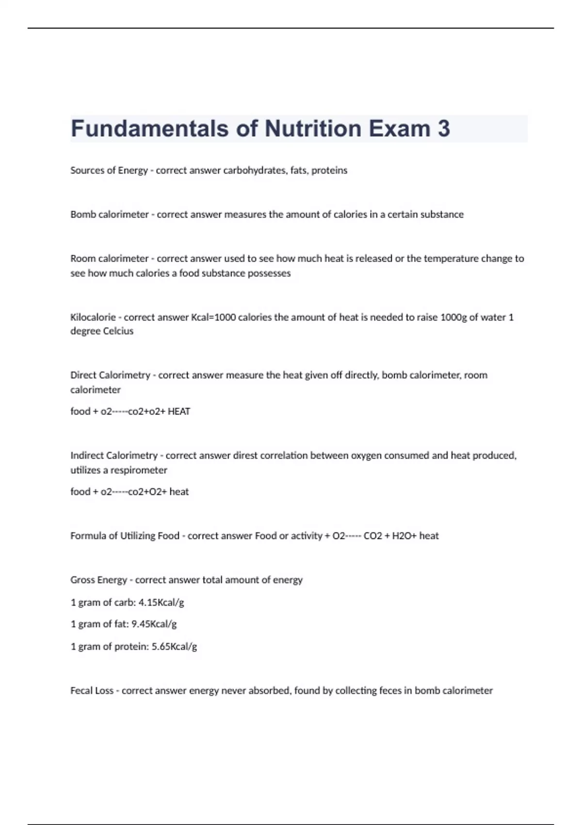Sources of Energy - correct answer carbohydrates, fats, proteins Bomb calorimeter - correct answer measures the amount of calories in a certain substance Room calorimeter - correct answer used to see how much heat is released or the temperature change to see how much calories a food substance possesses Kilocalorie - correct answer Kcal=1000 calories the amount of heat is needed to raise 1000g of water 1 degree Celcius Direct Calorimetry - correct answer measure the heat given off directly, bomb calorimeter, room calorimeter food + o2-----co2+o2+ HEAT Indirect Calorimetry - correct answer direst correlation between oxygen consumed and heat produced, utilizes a respirometer food + o2-----co2+O2+ heat Formula of Utilizing Food - correct answer Food or activity + O2----- CO2 + H2O+ heat Gross Energy - correct answer total amount of energy 1 gram of carb: 4.15Kcal/g 1 gram of fat: 9.45Kcal/g 1 gram of protein: 5.65Kcal/g Fecal Loss - correct answer energy never absorbed, found by collecting feces in bomb calorimeter