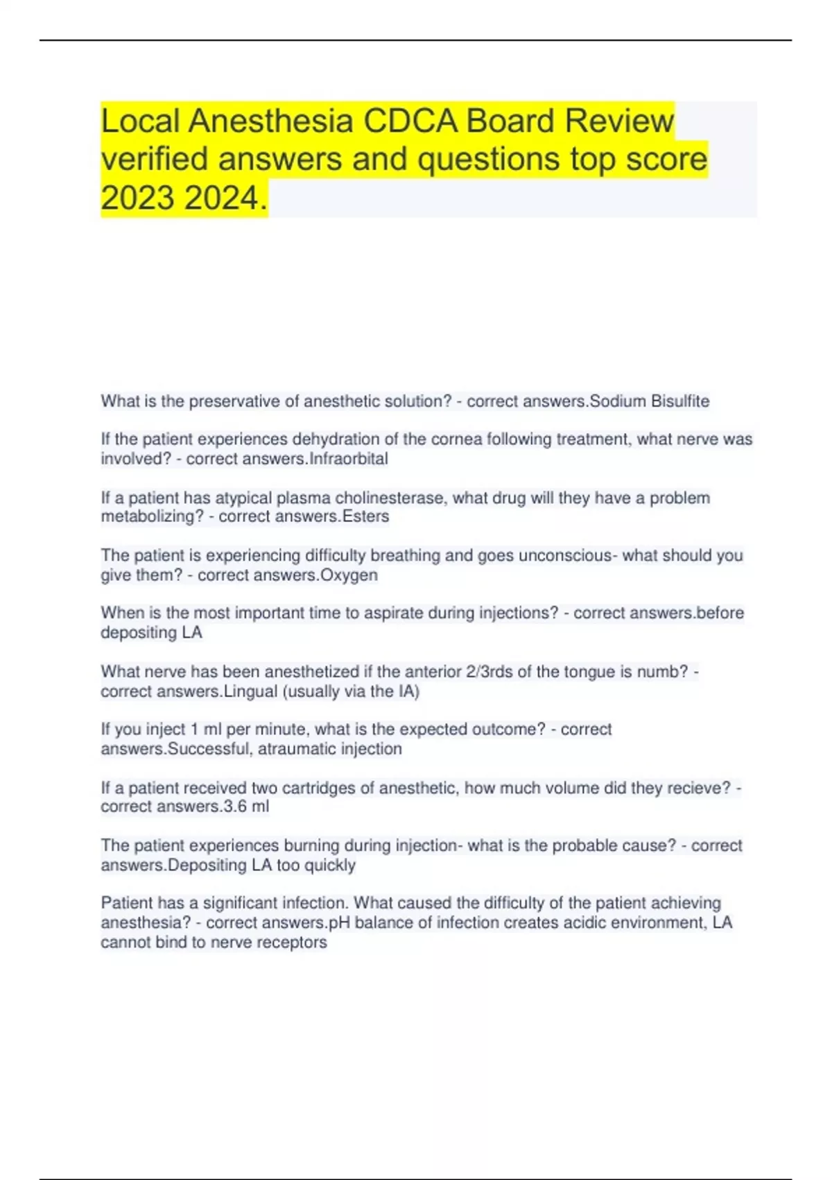 Local Anesthesia CDCA Board Review verified answers and questions top score .