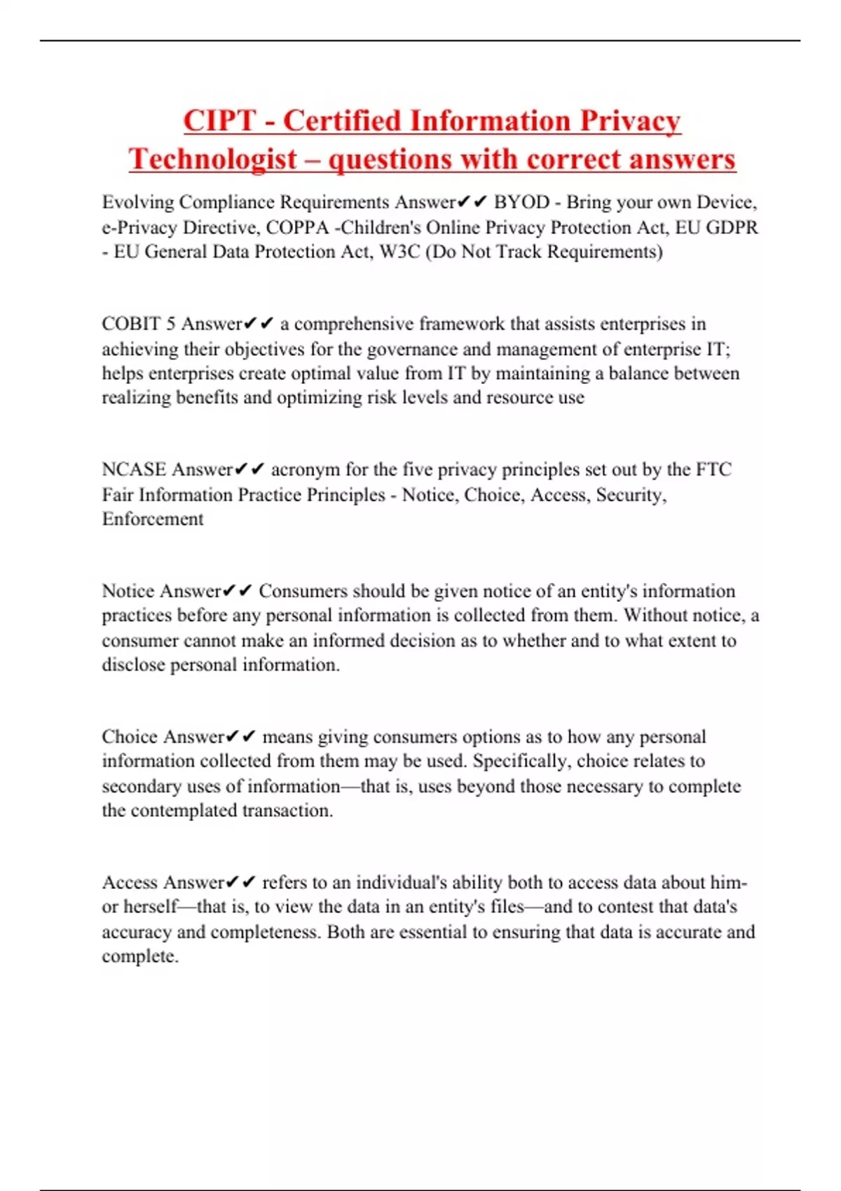Evolving Compliance Requirements Answer BYOD - Bring your own Device, e-Privacy Directive, COPPA -Children's Online Privacy Protection Act, EU GDPR - EU General Data Protection Act, W3C (Do Not Track Requirements) COBIT 5 Answer a comprehensive framework that assists enterprises in achieving their objectives for the governance and management of enterprise IT; helps enterprises create optimal value from IT by maintaining a balance between realizing benefits and optimizing risk levels and resource use NCASE Answer acronym for the five privacy principles set out by the FTC Fair Information Practice Principles - Notice, Choice, Access, Security, Enforcement Notice Answer Consumers should be given notice of an entity's information practices before any personal information is collected from them. Without notice, a consumer cannot make an informed decision as to whether and to what extent to disclose personal information. Choice Answer means giving consumers options as to how any personal information collected from them may be used. Specifically, choice relates to secondary uses of information—that is, uses beyond those necessary to complete the contemplated transaction. Access Answer refers to an individual's ability both to access data about him- or herself—that is, to view the data in an entity's files—and to contest that data's accuracy and completeness. Both are essential to ensuring that data is accurate and complete.