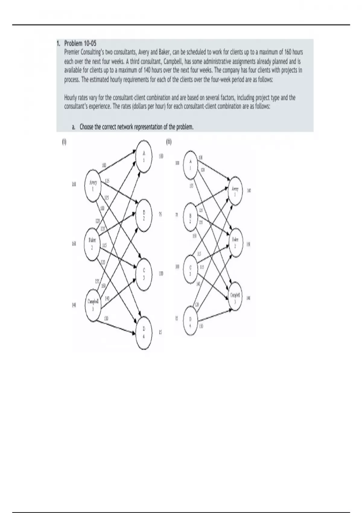 Problem 10-05: Premier Consulting’s two consultants, Avery and Baker, can be scheduled to work for clients up to a maximum of 160 hours each over the next four weeks. A third consultant, Campbell, has some administrative assignments already planned and is available for clients up to a maximum of 140 hours over the next four weeks. The company has four clients with projects in process. The estimated hourly requirements for each of the clients over the four-week period are as follows: Hourly rates vary for the consultant–client combination and are based on several factors, including project type and the consultant’s experience. The rates (dollars per hour) for each consultant–client combination are as follows: a. Choose the correct network representation of the problem. b. Formulate the problem as a linear program, with the optimal solution providing the hours each consultant should be scheduled for each client to maximize the consulting firm’s billings. What is the schedule and what is the total billing? Let xij = number of hours from consultant i assigned to client j. c. New information shows that Avery doesn’t have the experience to be scheduled for client B. If this consulting assignment is not permitted, what impact does it have on total billings? What is the revised schedule? Problem 10-25: Cleveland Area Rapid Delivery (CARD) operates a delivery service in the Cleveland metropolitan area. Most of CARD’s business involves rapid delivery of documents and parcels between offices during the business day. CARD promotes its ability to make fast and on-time deliveries anywhere in the metropolitan area. When a customer calls with a delivery request, CARD quotes a guaranteed delivery time. The following network shows the street routes available. The numbers above each arc indicate the travel time in minutes between the two locations. a. Develop a linear programming model that can be used to find the minimum time required to make a delivery from location 1 to location 6. For subtractive or negative numbers use a minus sign even if there is a + sign before the blank. b. How long does it take to make a delivery from location 1 to location 6? c. Assume that it is now 1:00 P.M. and that CARD just received a request for a pickup at location 1. The closest CARD courier is 8 minutes away from location 1. If CARD provides a 20% safety margin in guaranteeing a delivery time, what is the guaranteed delivery time if the package picked up at location 1 is to be delivered to location 6? Problem 10-21 (Algorithmic): United Express Service (UES) uses large quantities of packaging materials at its four distribution hubs. After screening potential suppliers, UES identified six vendors that can provide packaging materials that will satisfy its quality standards. UES asked each of the six vendors to submit bids to satisfy annual demand at each of its four distribution hubs over the next year. The following table lists the bids received (in thousands of dollars). UES wants to ensure that each of the distribution hubs is serviced by a different vendor. Which bids should UES accept, and which vendors should UES select to supply each distribution hub? Problem 10-13: Sports of All Sorts produces, distributes, and sells high-quality skateboards. Its supply chain consists of three factories (located in Detroit, Los Angeles, and Austin) that produce skateboards. The Detroit and Los Angeles facilities can produce 350 skateboards per week, but the Austin plant is larger and can produce up to 700 skateboards per week. Skateboards must be shipped from the factories to one of four distribution centers, or DCs (located in Iowa, Maryland, Idaho, and Arkansas). Each distribution center can process (repackage, mark for sale, and ship) at most 500 skateboards per week. Skateboards are then shipped from the distribution centers to retailers. Sports of All Sorts supplies three major U.S. retailers: Just Sports, Sports ’N Stuff, and The Sports Dude. The weekly demands are 200 skateboards at Just Sports, 500 skateboards at Sports ’N Stuff, and 650 skateboards at The Sports Dude. The following tables display the per-unit costs for shipping skateboards between the factories and DCs and for shipping between the DCs and the retailers. a. Choose the correct network representation of this problem. b. Build a model to minimize the transportation cost of a logistics system that will deliver skateboards from the factories to the distribution centers and from the distribution centers to the retailers. What is the optimal production strategy and shipping pattern for Sports of All Sorts? What is the minimum attainable transportation cost? If required, round your answers to two decimal places. c. Sports of All Sorts is considering expansion of the Iowa DC capacity to 800 units per week. The annual amortized cost of expansion is $40,000. Should the company expand the Iowa DC capacity so that it can process 800 skateboards per week? (Assume 50 operating weeks per year.) Problem 10-07 (Algorithmic): Aggie Power Generation supplies electrical power to residential customers for many U.S. cities. Its main power generation plants are located in Los Angeles, Tulsa, and Seattle. The following table shows Aggie Power Generation's major residential markets, the annual demand in each market (in megawatts or MWs), and the cost to supply electricity to each market from each power generation plant (prices are in $/MW). a. If there are no restrictions on the amount of power that can be supplied by any of the power plants, what is the optimal solution to this problem? Which cities should be supplied by which power plants? What is the total annual power distribution cost for this solution? If required, round your answers to two decimal places. b. If at most 4000 MWs of power can be supplied by any one of the power plants, what is the optimal solution? What is the annual increase in power distribution cost that results from adding these constrain