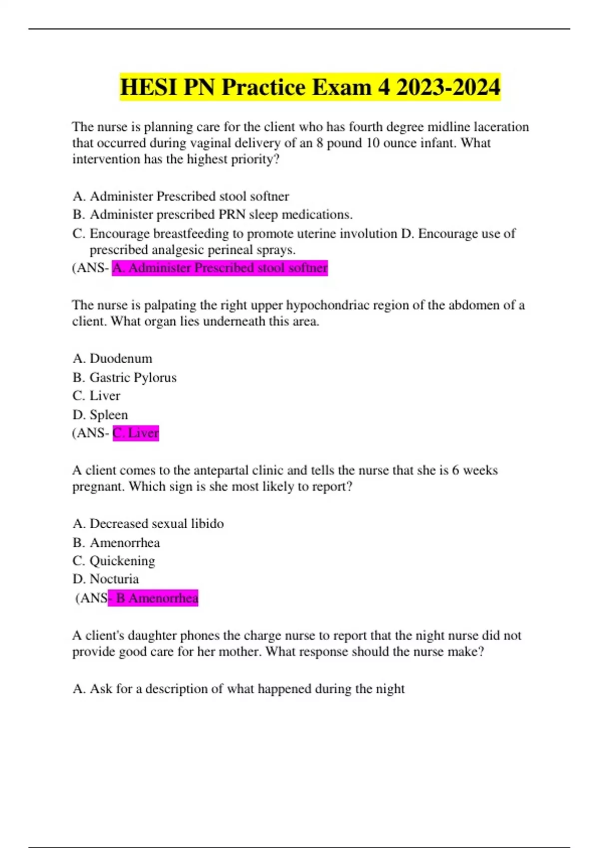 HESI PN Practice Exam The nurse is planning care for the client who has fourth degree midline laceration that occurred during vaginal delivery of an 8 pound 10 ounce infant. What intervention has the highest priority? A. Administer Prescribed stool softner B. Administer prescribed PRN sleep medications. C. Encourage breastfeeding to promote uterine involution D. Encourage use of prescribed analgesic perineal sprays. (ANS- A. Administer Prescribed stool softner The nurse is palpating the right upper hypochondriac region of the abdomen of a client. What organ lies underneath this area. A. Duodenum B. Gastric Pylorus C. Liver D. Spleen (ANS- C. Liver A client comes to the antepartal clinic and tells the nurse that she is 6 weeks pregnant. Which sign is she most likely to report? A. Decreased sexual libido B. Amenorrhea C. Quickening D. Nocturia (ANS- B Amenorrhea A client's daughter phones the charge nurse to report that the night nurse did not provide good care for her mother. What response should the nurse make? A. Ask for a description of what happened during the night B. Tell the daughter to talk to the unit's nurse manager C. Reassure the daughter that the mother will get better care. D. Explain that all the staff are doing the best they can. (ANS- A. Ask for a description of what happened during the night A hosptitalized toddler who is recovering from a sickle cell crisis holds a toy and say's "mine". According to Erikson's theory of psychosocial development, this child's behavior is a demonstration of which developmental stage? A. Autonomy vs. Shame and doubt. B. Industry vs. Inferiority C. intiative vs. Guilt D. Trust vs. Mistrust (ANS- A. Autonomy vs. Shame and doubt. Which action should the nurse implement in caring for a client following an electroencephalogram (EEG)? A. Monitor the client's vital signs q4h B. Assess for sensation in the client's lower extremities C. Instruct the client to maintain bed rest for eight hours D. Wash any paste from the client's hair and scalp (ANS- D. Wash any paste from the client's hair and scalp The nurse is caring for a 75- year-old male client who is beginning to form a decubitus ulcer at the coccyx. Which intervention will be most helpfull in preventing further development of the decubitus? A. Encourage the client to eat foods high in protein B. Assess the client with daily range of motion exercises C. Teach the family how to perform sterile wound care D. Ensure the IV fluids are administered as prescribed (ANS- A. Encourage the client to eat foods high in protei