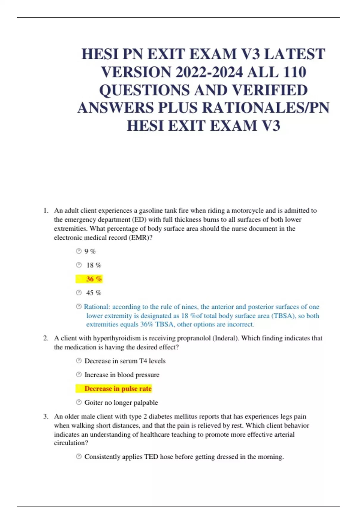 HESI PN EXIT EXAM V3 LATEST VERSION ALL 110 QUESTIONS AND VERIFIED ANSWERS PLUS RATIONALES/PN HESI EXIT EXAM V3 1. An adult client experiences a gasoline tank fire when riding a motorcycle and is admitted to the emergency department (ED) with full thickness burns to all surfaces of both lower extremities. What percentage of body surface area should the nurse document in the electronic medical record (EMR)? 9 % 18 % 36 % 45 % Rational: according to the rule of nines, the anterior and posterior surfaces of one lower extremity is designated as 18 %of total body surface area (TBSA), so both extremities equals 36% TBSA, other options are incorrect. 2. A client with hyperthyroidism is receiving propranolol (Inderal). Which finding indicates that the medication is having the desired effect? Decrease in serum T4 levels Increase in blood pressure Decrease in pulse rate Goiter no longer palpable 3. An older male client with type 2 diabetes mellitus reports that has experiences legs pain when walking short distances, and that the pain is relieved by rest. Which client behavior indicates an understanding of healthcare teaching to promote more effective arterial circulation? Consistently applies TED hose before getting dressed in the morning. Frequently elevated legs thorough the day. Inspect the leg frequently for any irritation or skin breakdown Completely stop cigarette/ cigar smoking. Rationale: Stopping cigarette smoking helps to decrease vasoconstriction and improve arterial circulation to the extremity. 4. A community health nurse is concerned about the spread of communicable diseases among migrant farm workers in a rural community. What action should the nurse take to promote the success of a healthcare program designed to address this problem? Establish trust with community leaders and respect cultural and family values 5. The nurse performs a prescribed neurological check at the beginning of the shift on a client who was admitted to the hospital with a subarachnoid brain attack (stroke). The client’s Glasgow Coma Scale (GCS) score is 9. What information is most important for the nurse to determine? The client’s previous GCS score When the client’s stroke symptoms started If the client is oriented to time The client’s blood pressure and respiration rate Rationale: The normal GCS is 15, and it is most important for the nurse to determine if it abnormal score a sign of improvement or a deterioration in the client’s condition 6. The charge nurse in a critical care unit is reviewing clients’ conditions to determine who is stable enough to be transferred. Which client status report indicates readiness for transfer from the critical care unit to a medical unit? Chronic liver failure with a hemoglobin of 10.1 and slight bilirubin elevatio