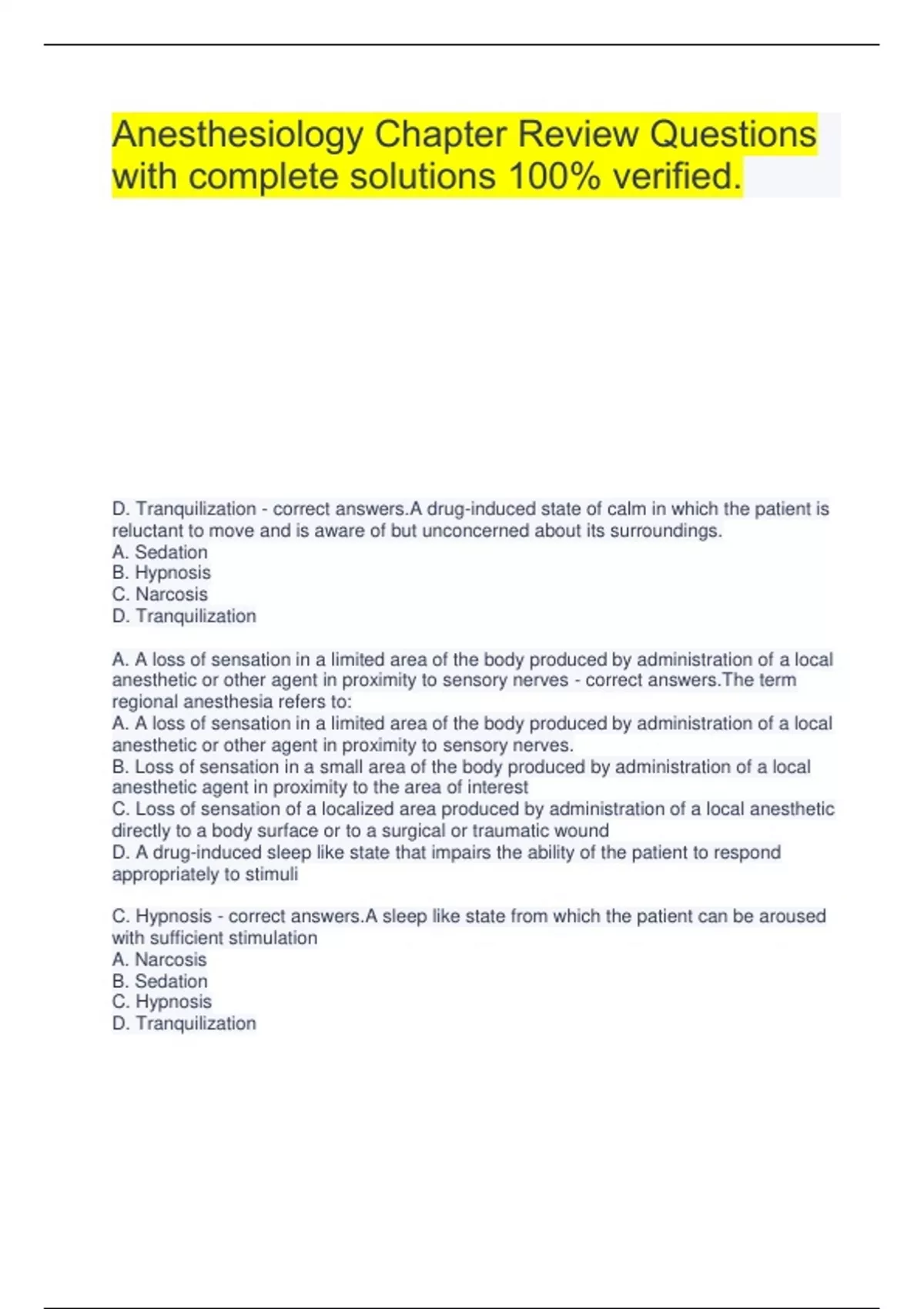 Anesthesiology Chapter Review Questions with complete solutions 100% verified. D. Tranquilization - correct answers.A drug-induced state of calm in which the patient is reluctant to move and is aware of but unconcerned about its surroundings. A. Sedation B. Hypnosis C. Narcosis D. Tranquilization A. A loss of sensation in a limited area of the body produced by administration of a local anesthetic or other agent in proximity to sensory nerves - correct answers.The term regional anesthesia refers to: A. A loss of sensation in a limited area of the body produced by administration of a local anesthetic or other agent in proximity to sensory nerves. B. Loss of sensation in a small area of the body produced by administration of a local anesthetic agent in proximity to the area of interest C. Loss of sensation of a localized area produced by administration of a local anesthetic directly to a body surface or to a surgical or traumatic wound D. A drug-induced sleep like state that impairs the ability of the patient to respond appropriately to stimuli C. Hypnosis - correct answers.A sleep like state from which the patient can be aroused with sufficient stimulation A. Narcosis B. Sedation C. Hypnosis D. Tranquilization B. Administration of multiple drugs concurrently in smaller quantities than would be required if each were given alone - correct answers.The term balanced anesthesia refers to: A. The administration of two or more agents in equal volume B. Administration of multiple drugs concurrently in smaller quantities than would be required if each were given alone C. General anesthesia in which the patient's physiologic status remains stable D. The administration of a local and general anesthetic concurrently A, B, D - correct answers.With sufficient stimulation, a patient can be aroused from: A. Sedation B. Narcosis C. General anesthesia D. Hypnosis A, D - correct answers.Which of the following statements about anesthesia is/are false? A. Anesthetic agents have wide therapeutic indices. B. There is always a risk to patient safety when anesthetic are administered. C. Most anesthetic cause significant changes in cardiopulmonary function D. Administration of anesthetic is routine and thus requires no specialized skills C. How many times a week does your pet go for a walk or exercise, Mrs. Jones - correct answers.In gathering a patient history, which of the following would be the best way to frame a question about a patient's exercise level? A. Your dog does not exercise much, does he, Mrs. Jones? B. Does your dog exercise, Mrs. Jones? C. How many times a week does your pet go for a walk or exercise, Mrs. Jones? D. You don't give your dog as much exercise as you should, do you, Mrs. Jones? B. The use of anticholinergic is recommended in ruminants to avoid airway occlusion - correct answers.Which of the following examples of species associations is not correct? A. Horses and cats are more sensitive to opioids than dogs and ruminants B. The use of anticholinergic is recommended in ruminants to avoid airway occlusion C. Horses may fracture limbs during anesthetic recovery and thus require special attention during the recovery period D. Large animals are prone to respiratory depression and dependent atelectasis and thus often require ventilatory support D. A dog with a body condition score of 8/9 will require more anesthetic per unit body weight than a dog of the same breed with a body condition score of 5/9 - correct answers.Which of the following statements regarding physical examination findings is incorrect? A. Dehydration increases the risk of hypotension B. Anemia predisposes the patient to hypoxemia C. Patients with bruising may be a higher risk for potentially life-threatening intraoperative and postoperative bleeding. D. A dog with a body condition score of 8/9 will require more anesthetic per unit body weight than a dog of the same breed with a body condition score of 5/9 C. Stuporous - correct answers.You are evaluating a patient's LOC and find the patient in a sleep like state, non responsive to a verbal stimulus but arousable by a painful stimulus. The patient is: A. Lethargic B. Obtunded C. Stuporous D. Comatose A. Hydrated - correct answers.You are evaluating a patient's hydration. The skin elasticity is mildly slowed, the patient's mucous membranes are tacky, the CRT is 1.5 seconds, but the eyes are in normal position in the orbit. Your patient is: A. Hydrated B. Approximately 5% dehydrated C. Approximately 8% dehydrated D. Greater than 10% dehydrated B. Horse: 2 to 4 hours - correct answers.Which of the following fasting times is least advisable? A. Dog: 8 to 12 hours B. Horse: 2 to 4 hours C. Cow: 24 to 48 hours D. Small ruminant: 12 to 18 hours C. Class P3 - correct answers.Using the ASA Physical Status Classification system, a patient that is moderately anemic or moderately dehydrated would be classified as: A. Class P1 B. Class P2 C. Class P3 D. Class P4 E. Class P5 A. Increased respiratory effort - correct answers.Which of the following signs of disease in a calm canine patient would be most significant in terms of the potential to increase the risk of anesthesia? A. Increased respiratory effort B. Lethargy C. A body temperature of 103.4 F D. A sinus arrhythmia A. Brachycephalic breeds - correct answers.Which of the following species or breeds must be watched especially closely during any anesthetic procedure to ensure a patent airway? A. Brachycephalic breeds