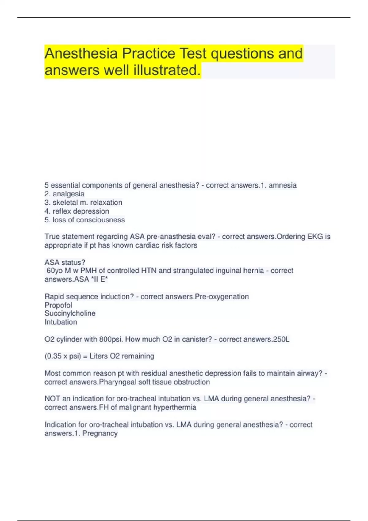 Anesthesia Practice Questions from 2019 website questions and answers 100% verified. What is the definition of anesthesia? - correct answers.Loss of sensation to the entire or any part of the body Which of the following is NOT a characteristic of GA? a. absence of reflex responses b. analgesia c. complete unconsciousness d. bradycardia e. muscle relaxation f. reversibility - correct answers.D You have induced your dog and are ready to intubate him. He has no palpebral reflex and minimal to no jaw tone. What stage of general anesthesia has he reached? - correct 3 As you recover your dog from surgery, he seems to pass through a dysphoric phase in which he thrashes/flops around his cage and howls. In what stage of general anesthesia is he? - correct 2 If your patient reaches Stage 4 of general anesthesia, what two steps are essential to correct the problem? - correct down the vaporizer (no more inhalant); initiate manual ventilation What is one of the first signs that you are reaching a deep plane of surgical anesthesia? a. Anal sphincter tone is lost b. Corneal reflexes are lost c. Patient demonstrates nystagmus d. Patient is lacrimating - correct answers.A List three elements that are important to the preanesthetic patient evaluation. - correct answers.Signalment, medical history, physical examination, diagnostic tests, procedure being performed and operative risk Name three body systems that should be assessed during a preanesthetic physical exam. - correct answers.CV, resp, CNS Which of the following is the most important diagnostic test to run before anesthesia? a. Blood glucose (BG) b. Blood urea nitrogen (BUN) c. Complete blood count (CBC) d. Packed cell volume (PCV) e. Urinalysis (UA) - correct answers.D List 3 factors to consider in determining anesthetic risk. - correct answers.Invasiveness of surgery Physical status of patient (stability, systemic problems) Length of surgery Depth of anesthesia required Potential for hemorrhage Type of anesthetic being used Species/breed concerns What is the MAC? - correct answers.The concentration of inhaled anesthetic at 1 atmosphere that prevents gross voluntary movement in response to a supramaximal stimulus (e.g. surgical incision) in 50% of patients. In laymen's terms, it is the amount of inhaled anesthetic that overcomes a patient's voluntary ability to move under painful stimuli. True / False: Potency of an inhaled anesthetic is directly related to the MAC. - correct answers.False: A high MAC means a high concentration is needed to prevent movement, meaning the drug has low potency. The two are indirectly related. Put the following in order of the circuit from the oxygen supply to the scavenging system: a. Flowmeter, pressure reducing regulator, vaporizer, patient breathing circuit b. Flowmeter, vaporizer, pressure reducing regulator, patient breathing circuit c. Pressure reducing regulator, flowmeter, vaporizer, patient breathing circuit d. Pressure reducing regulator, vaporizer, flowmeter, patient breathing circuit - correct answers.C What is the difference between primary and secondary medical gas supplies? - correct answers.Primary gas supplies are hospitalwide central gas pipeline systems, usually