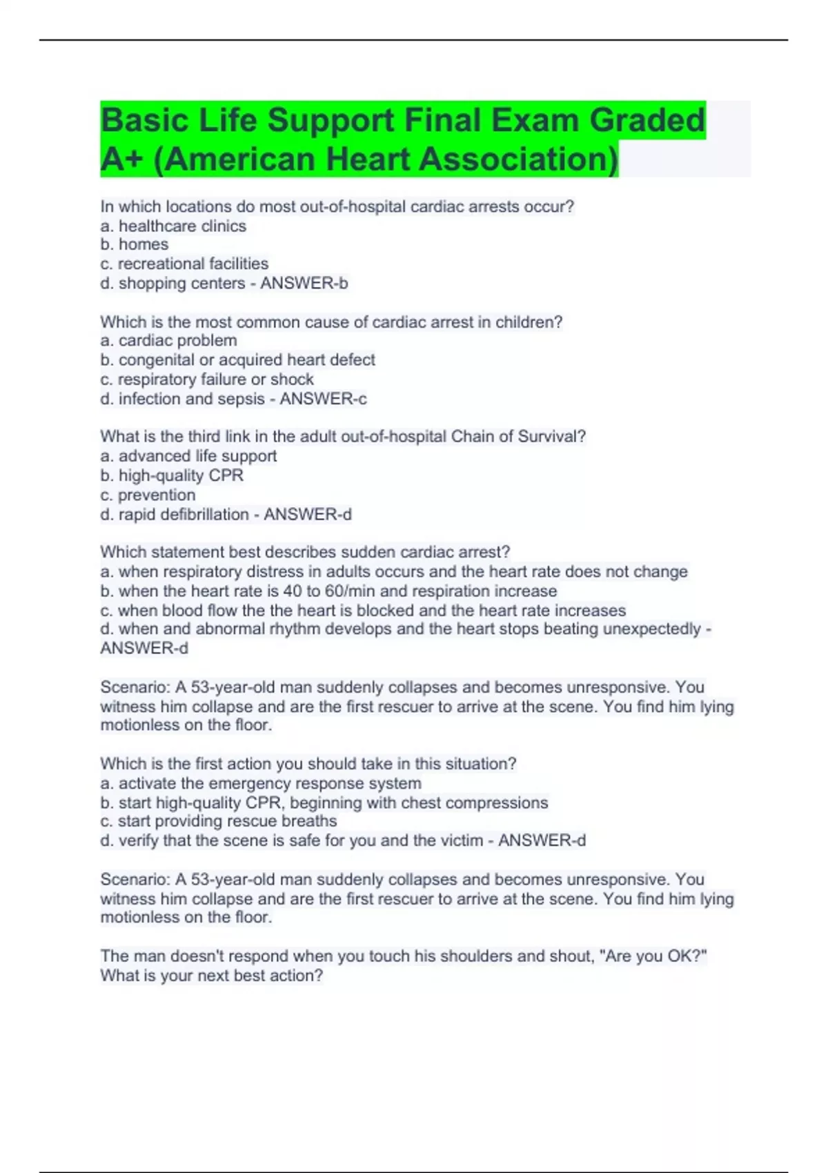 In which locations do most out-of-hospital cardiac arrests occur? a. healthcare clinics b. homes c. recreational facilities d. shopping centers - ANSWER-b Which is the most common cause of cardiac arrest in children? a. cardiac problem b. congenital or acquired heart defect c. respiratory failure or shock d. infection and sepsis - ANSWER-c What is the third link in the adult out-of-hospital Chain of Survival? a. advanced life support b. high-quality CPR c. prevention d. rapid defibrillation - ANSWER-d Which statement best describes sudden cardiac arrest? a. when respiratory distress in adults occurs and the heart rate does not change b. when the heart rate is 40 to 60/min and respiration increase c. when blood flow the the heart is blocked and the heart rate increases d. when and abnormal rhythm develops and the heart stops beating unexpectedly - ANSWER-d Scenario: A 53-year-old man suddenly collapses and becomes unresponsive. You witness him collapse and are the first rescuer to arrive at the scene. You find him lying motionless on the floor. Which is the first action you should take in this situation? a. activate the emergency response system b. start high-quality CPR, beginning with chest compressions c. start providing rescue breaths d. verify that the scene is safe for you and the victim - ANSWER-d Scenario: A 53-year-old man suddenly collapses and becomes unresponsive. You witness him collapse and are the first rescuer to arrive at the scene. You find him lying motionless on the floor. The man doesn't respond when you touch his shoulders and shout, "Are you OK?" What is your next best action?