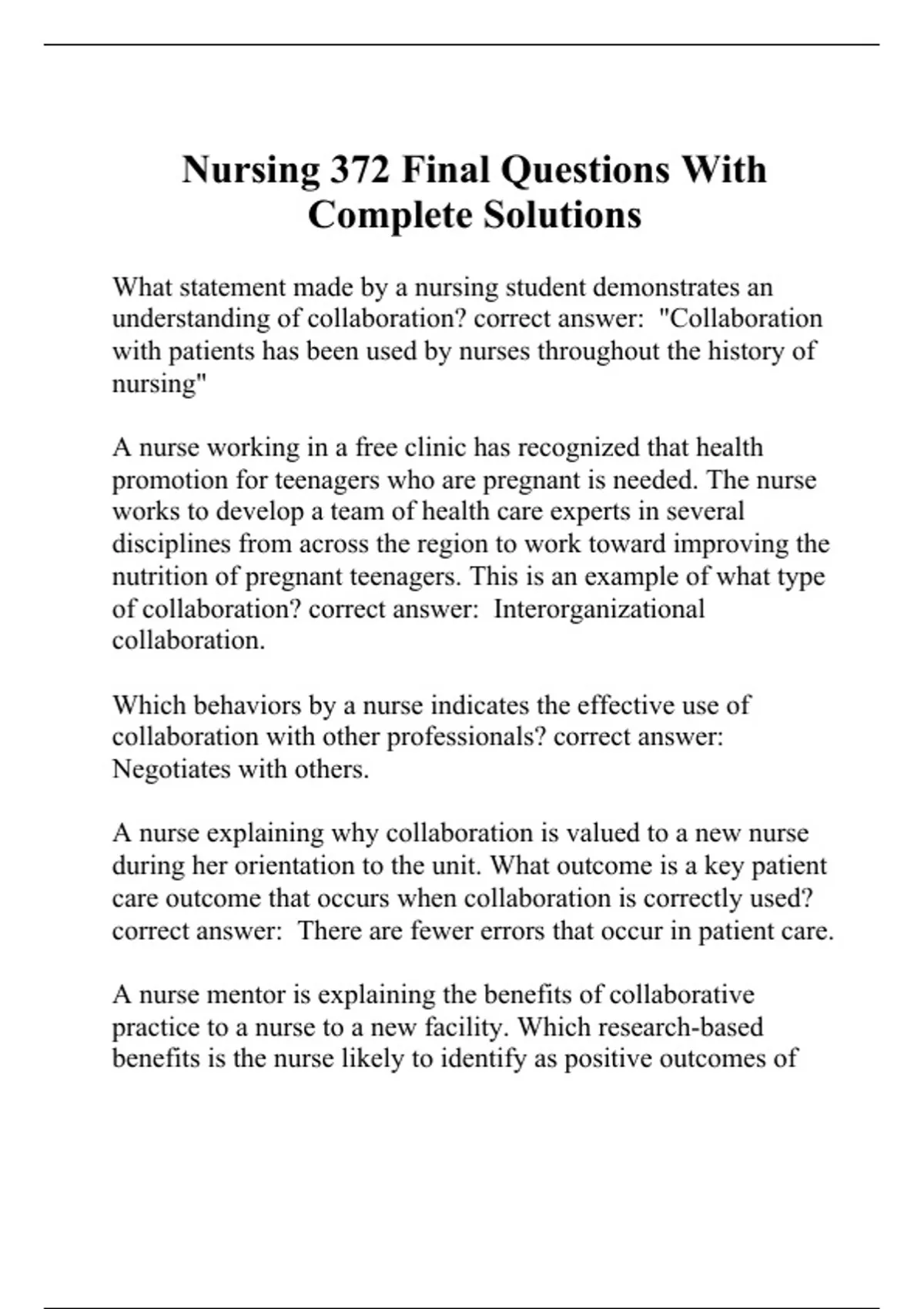 What statement made by a nursing student demonstrates an understanding of collaboration? correct answer: "Collaboration with patients has been used by nurses throughout the history of nursing" A nurse working in a free clinic has recognized that health promotion for teenagers who are pregnant is needed. The nurse works to develop a team of health care experts in several disciplines from across the region to work toward improving the nutrition of pregnant teenagers. This is an example of what type of collaboration? correct answer: Interorganizational collaboration. Which behaviors by a nurse indicates the effective use of collaboration with other professionals? correct answer: Negotiates with others. A nurse explaining why collaboration is valued to a new nurse during her orientation to the unit. What outcome is a key patient care outcome that occurs when collaboration is correctly used? correct answer: There are fewer errors that occur in patient care. A nurse mentor is explaining the benefits of collaborative practice to a nurse to a new facility. Which research-based benefits is the nurse likely to identify as positive outcomes of collaboration? correct answer: Decreased length of stay for patients, decreased staff resignations, increased job satisfac