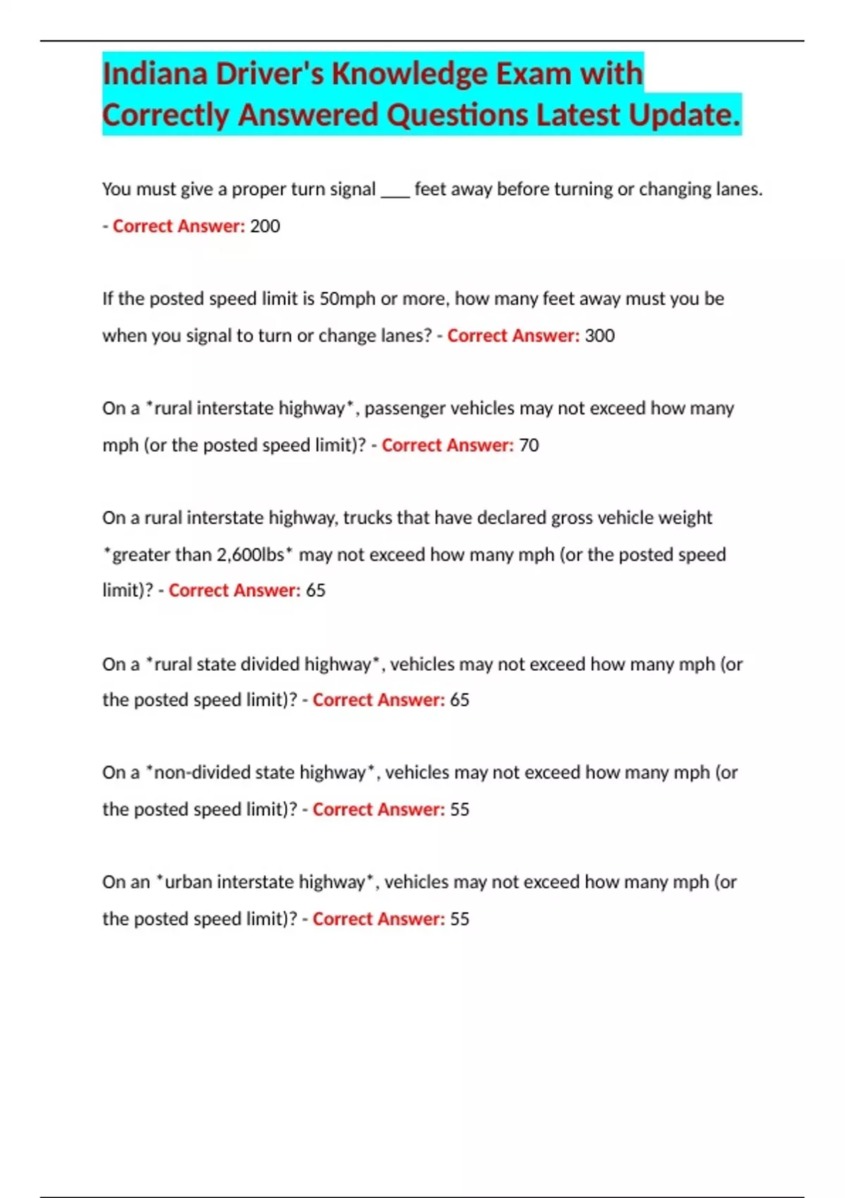 Indiana Driver's Knowledge Exam with Correctly Answered Questions Latest Update.
