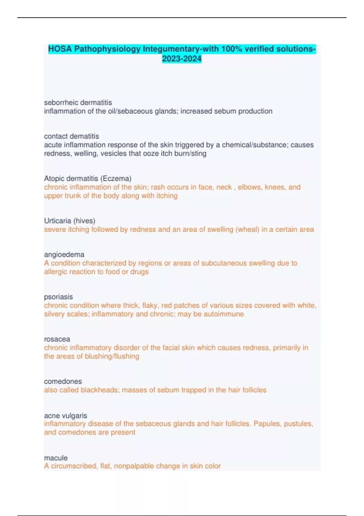 HOSA Pathophysiology Integumentary-with 100% verified solutions-