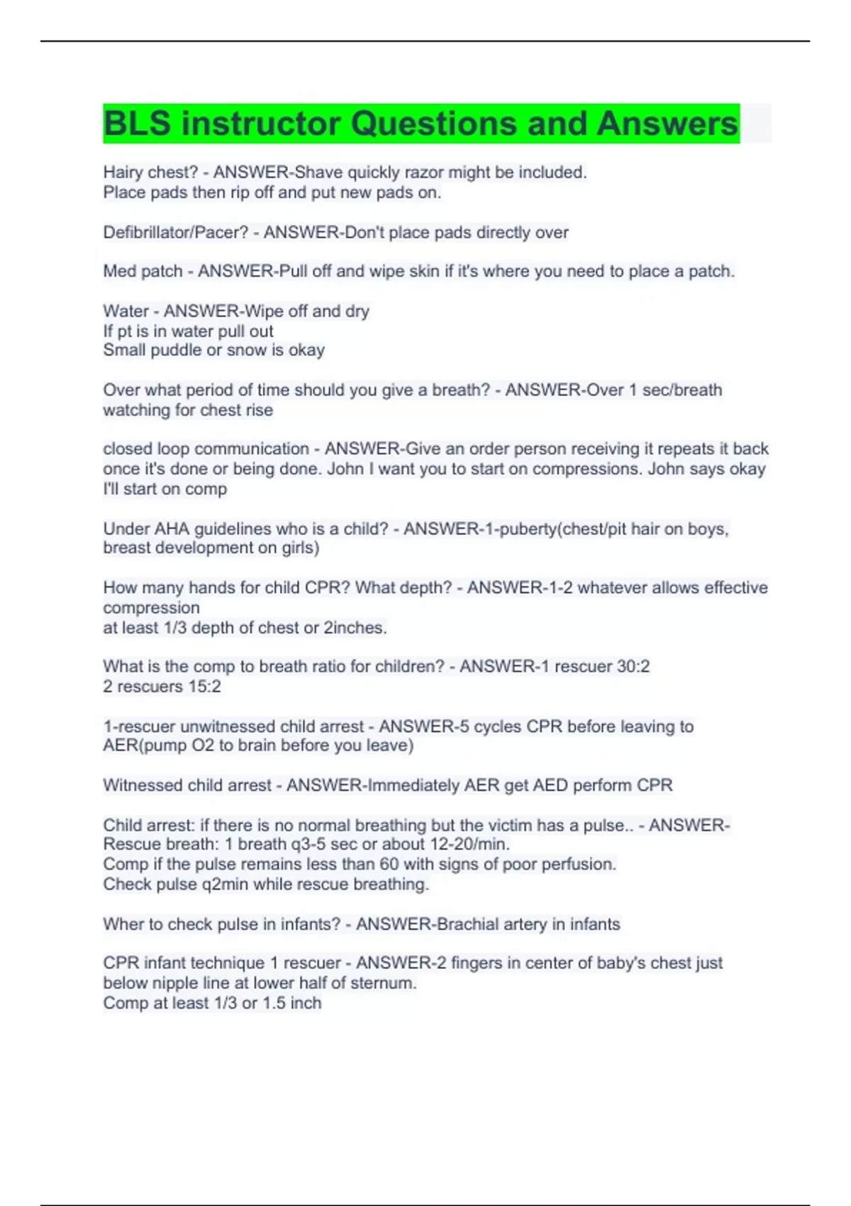 Hairy chest? - ANSWER-Shave quickly razor might be included. Place pads then rip off and put new pads on. Defibrillator/Pacer? - ANSWER-Don't place pads directly over Med patch - ANSWER-Pull off and wipe skin if it's where you need to place a patch. Water - ANSWER-Wipe off and dry If pt is in water pull out Small puddle or snow is okay Over what period of time should you give a breath? - ANSWER-Over 1 sec/breath watching for chest rise closed loop communication - ANSWER-Give an order person receiving it repeats it back once it's done or being done. John I want you to start on compressions. John says okay I'll start on comp Under AHA guidelines who is a child? - ANSWER-1-puberty(chest/pit hair on boys, breast development on girls) How many hands for child CPR? What depth? - ANSWER-1-2 whatever allows effective compression at least 1/3 depth of chest or 2inches. What is the comp to breath ratio for children? - ANSWER-1 rescuer 30:2 2 rescuers 15:2 1-rescuer unwitnessed child arrest - ANSWER-5 cycles CPR before leaving to AER(pump O2 to brain before you leave) Witnessed child arrest - ANSWER-Immediately AER get AED perform CPR Child arrest: if there is no normal breathing but the victim has a pulse.. - ANSWER-Rescue breath: 1 breath q3-5 sec or about 12-20/min. Comp if the pulse remains less than 60 with signs of poor perfusion. Check pulse q2min while rescue breathing. Wher to check pulse in infants? - ANSWER-Brachial artery in infants CPR infant technique 1 rescuer - ANSWER-2 fingers in center of baby's chest just below nipple line at lower half of sternum. Comp at least 1/3 or 1.5 inch