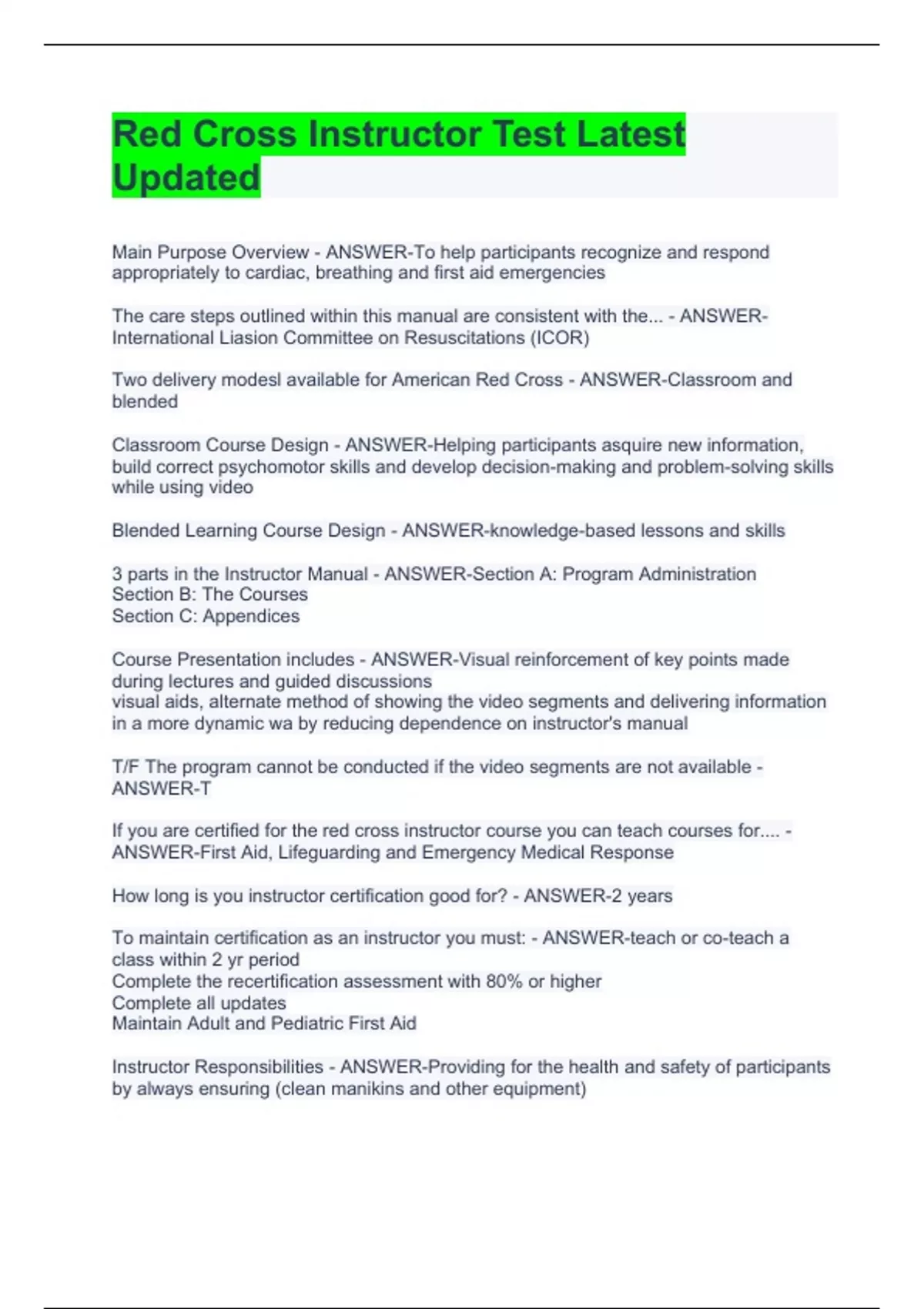 All of the following are responsibilities of an American Red Cross Instructor except: - ANSWER-Ensure that all state licensing requirements have been met. When providing basic life support care, what is the chest compression fraction goal? - ANSWER-80% Program delivery methods for the Basic Life Support for Healthcare Providers base-level program include: - ANSWER-Both instructor-led and blended The maximum ratio of instructor to participants for the American Red Cross Basic Life Support for Healthcare Providers course is: - ANSWER-1:12 The purpose of the American Red Cross Basic Life Support for Healthcare Providers course is to ensure that individuals with a duty to respond have the knowledge and skills to respond to patients who are experiencing respiratory and cardiac arrest and airway obstruction. - ANSWER-True To complete the American Red Cross Basic Life Support for Healthcare Providers course and recieve certification as participant must: - ANSWER-Demonstrate competency in all required skills and activities. Where can you find the latest procedures on how to set up, view and offer a blended learning course? - ANSWER-Instructors Corner In the full Instructor-Led Course, instructors are required to teach: - ANSWER-Either Module 2 or Module 3 Which of the following can be found on Instructor's Corner? - ANSWER-All the above When checking a patient for responsiveness, a Basic Life Support for Healthcare Providers participant should follow which sequence? - ANSWER- When providing care for a patient in cardiac arrest, participants should minimize interruptions in chest compressions to a maximum of: - ANSWER-10 Seconds Instructors are required to visit Instructor's Corner regularly. - ANSWER-True When performing CPR on an adult patient, chest compressions should be at least__ inches deep to promote adequate circulation. - ANSWER-2